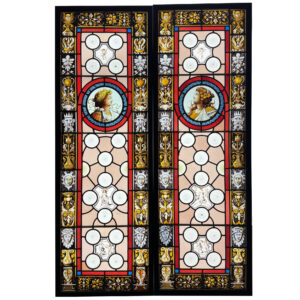 Vitrail Vitraux aux blasons scènes chevaleresque (H54cm L42cm)