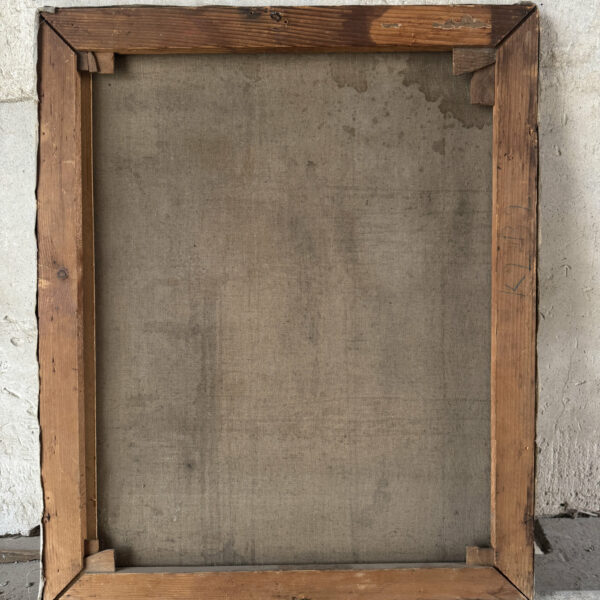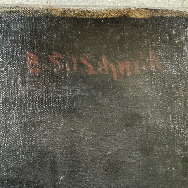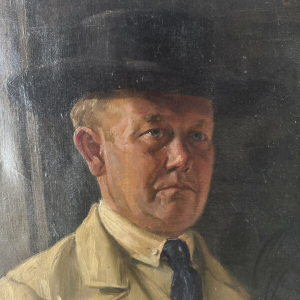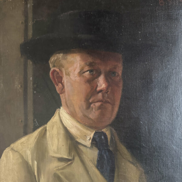 Oil painting depicting a self-portrait of a painter holding his palette and brush, elegantly dressed in a jacket and hat. Signed top right.