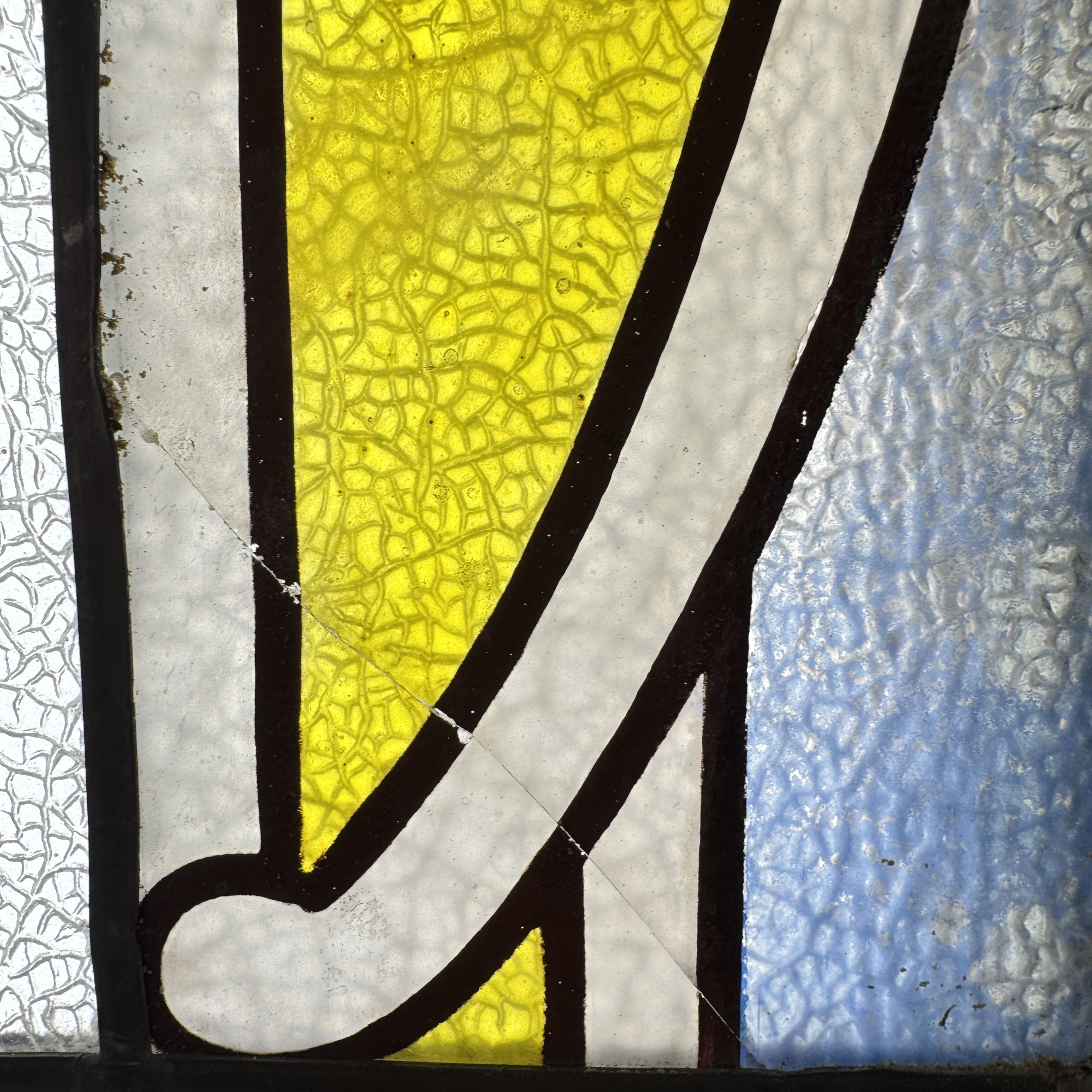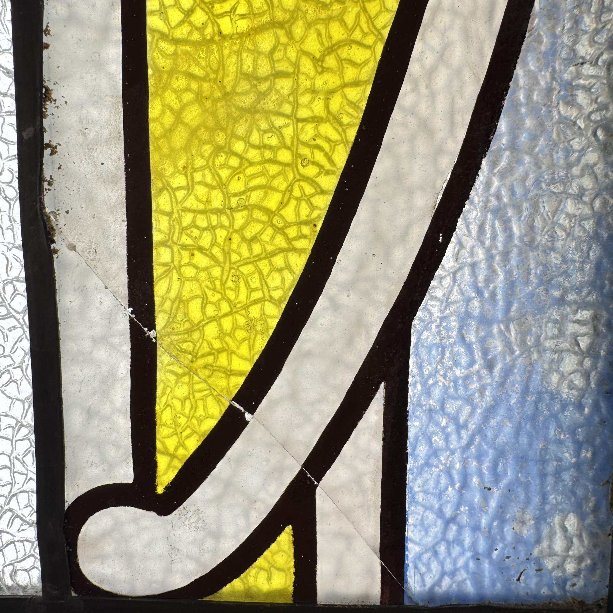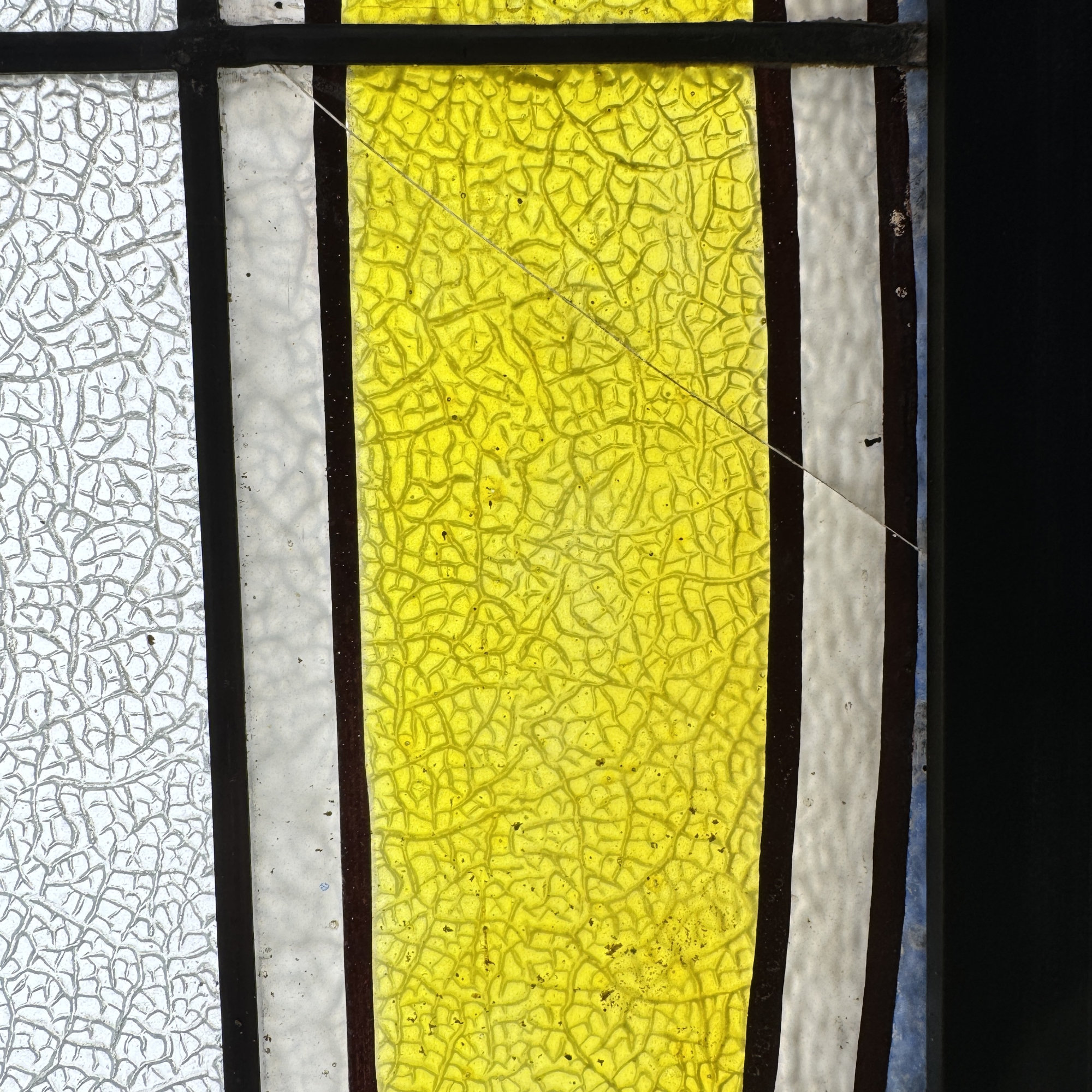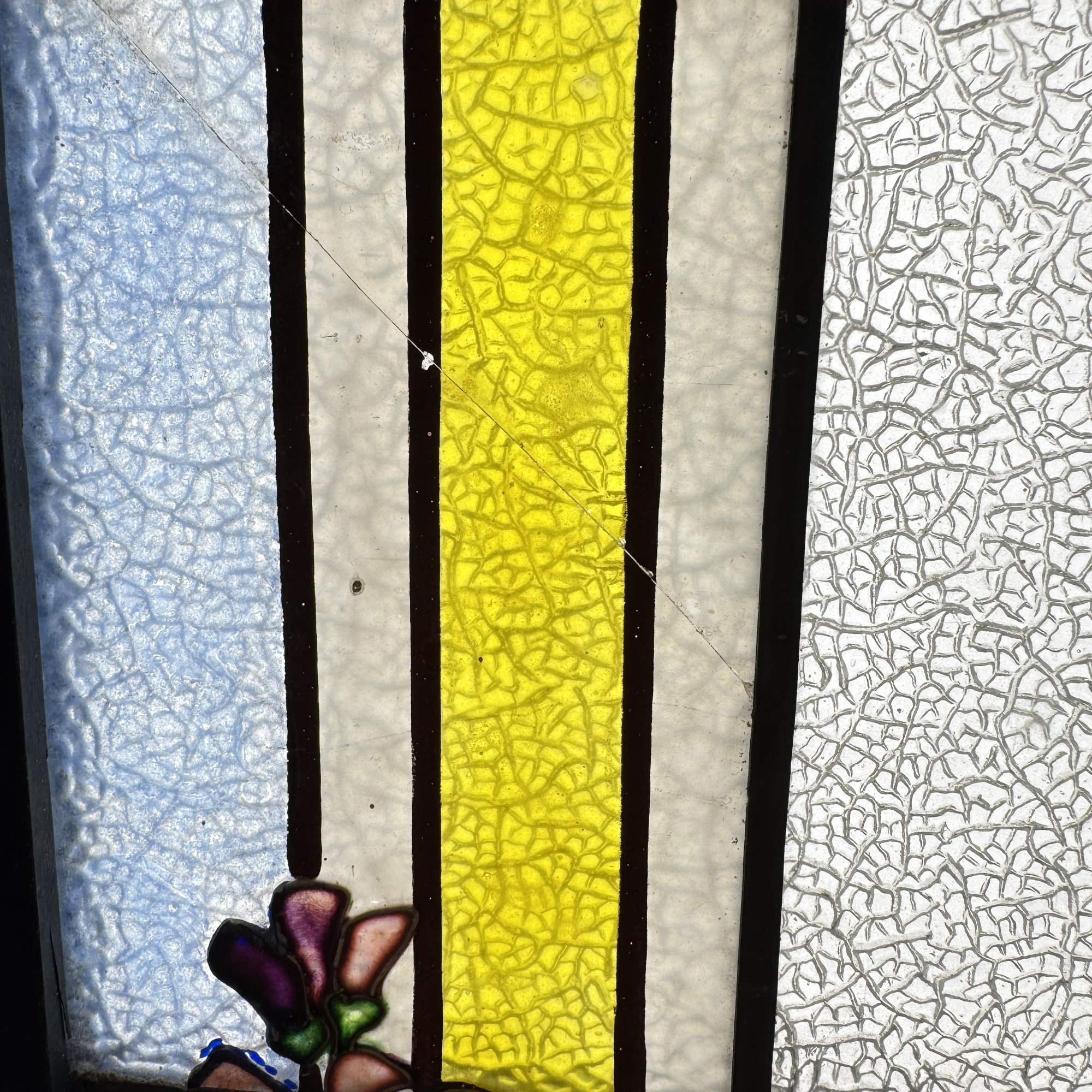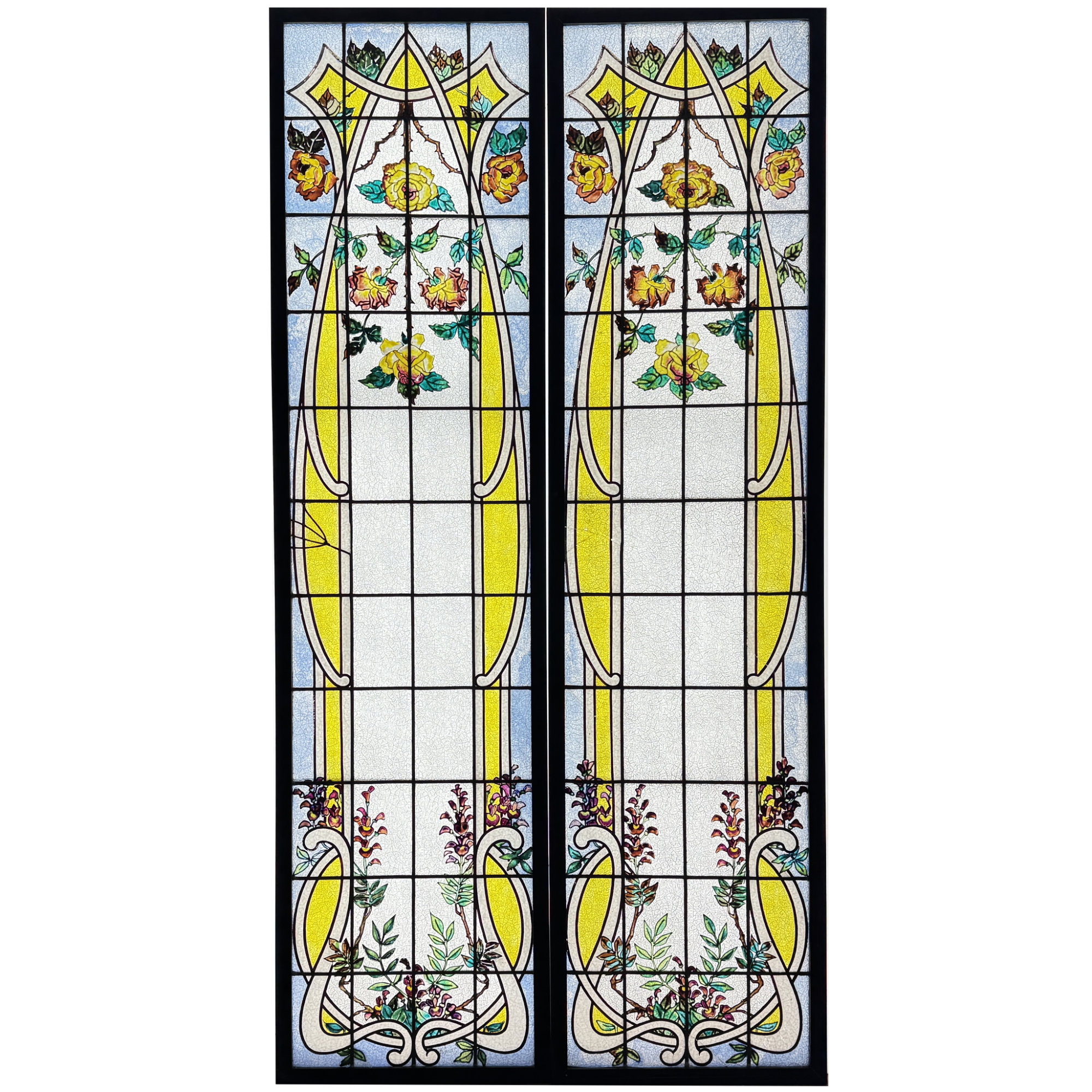 Paire de vitraux Art Nouveau aux arabesques dans les tons jaune. Dans la partie supérieure des roses, dans la partie inférieure des lupins. Technique d’émaux cloisonnés. Châssis en bois.