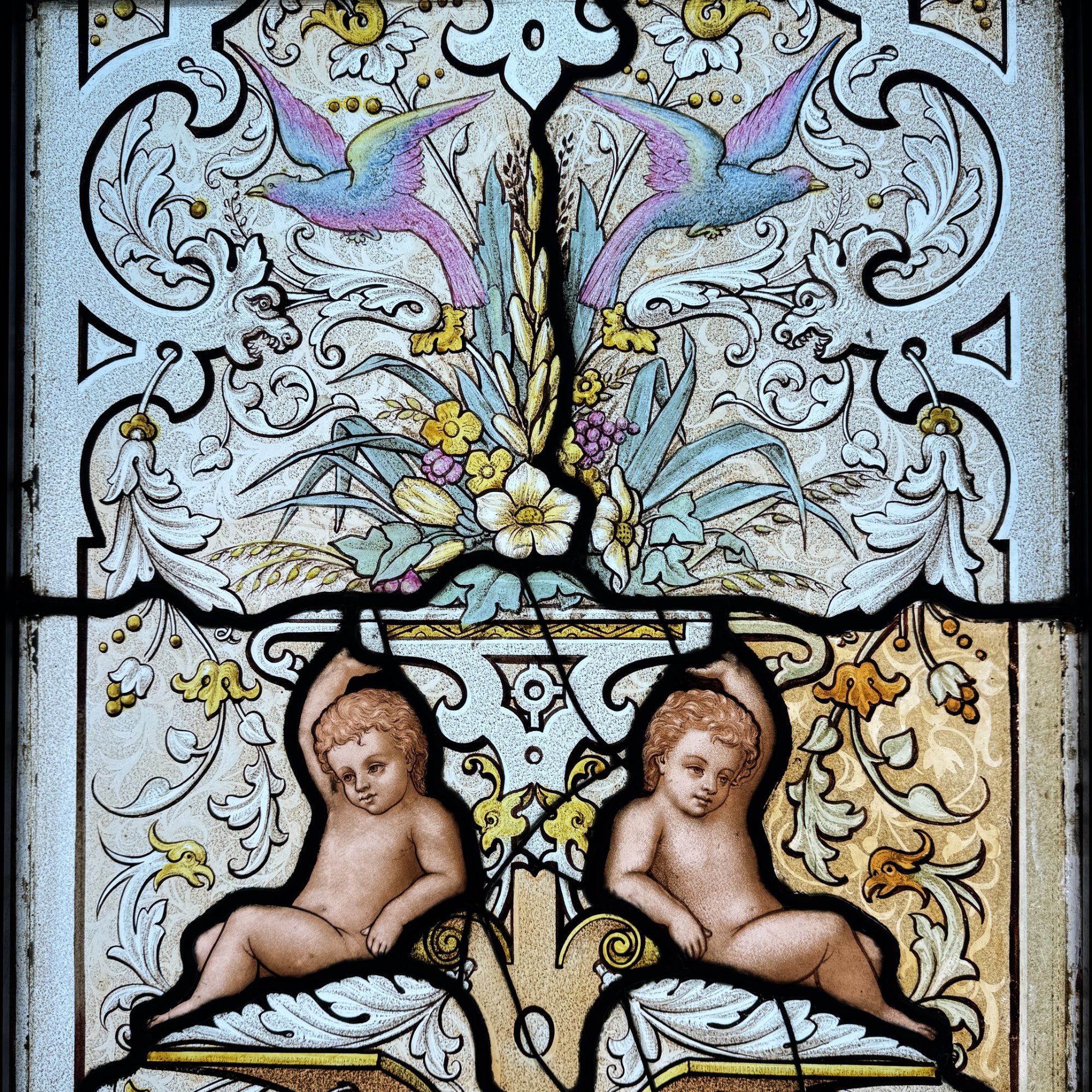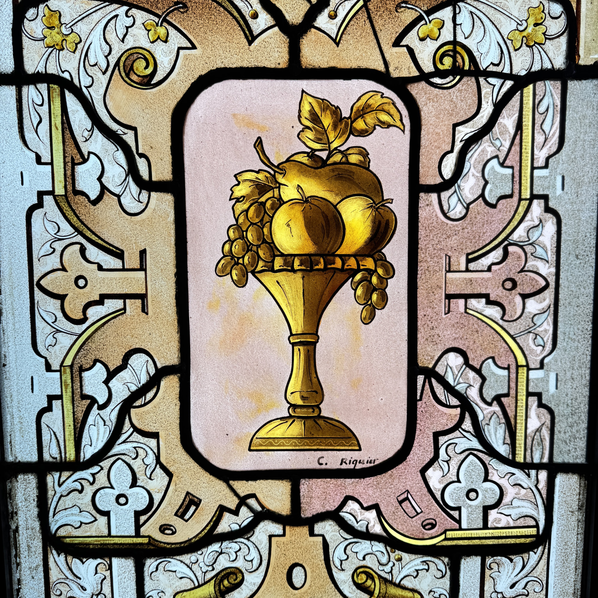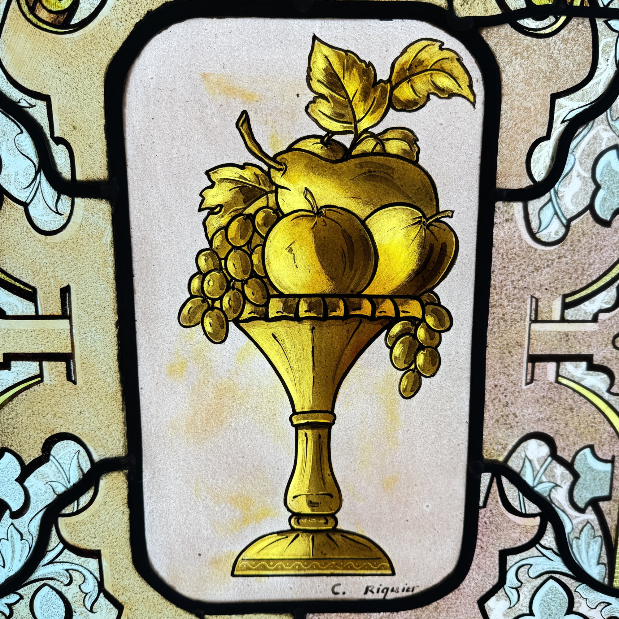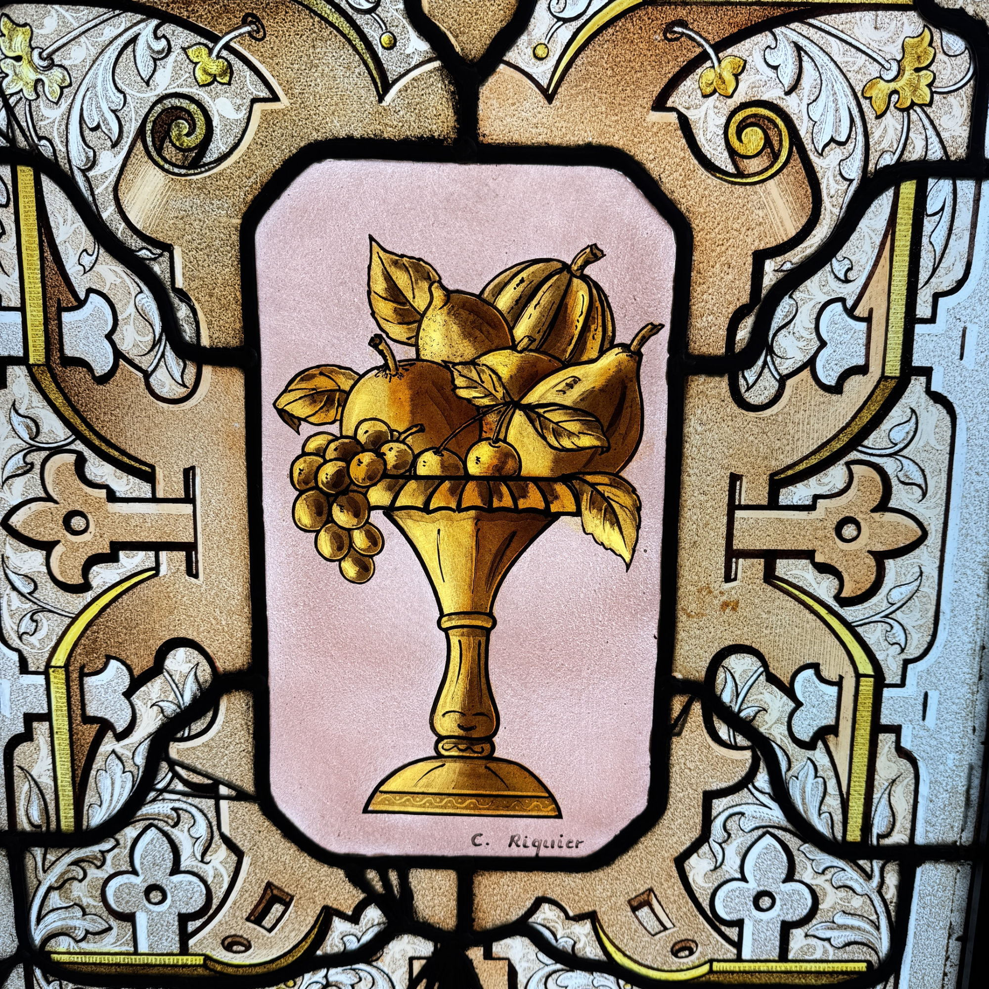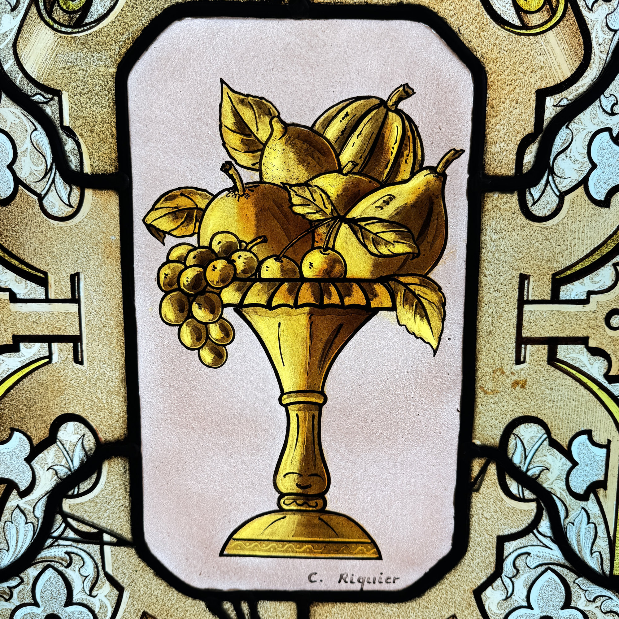 Claude Riquier (1835-1878) est un peintre verrier parisien bien qu’originaire d’Auvergne. Elève de E. Didron et collaborateur du cartonnier Louis Steinheil, il est également connu sous le nom de Riquier-Vellaud suite à son mariage avec Anne-Elise Vellaud en 1859. Il réalise des verrières pour l’église St Etienne du Mont (histoire de Sainte Genevièvre en 1869 et en 1877), on retrouve également son travail à Poitiers avec un vitrail pour l’hôtel de ville consacré à Aliénor d’Aquitaine en 1874, et à La Membrolle sur Choisille dans l’église Notre-Dame des Eaux. En 1872, il publie des annonces publicitaires le présentant comme “créateur de vitraux civils d’appartements”. En 1878, il participe à l’Exposition Universelle.