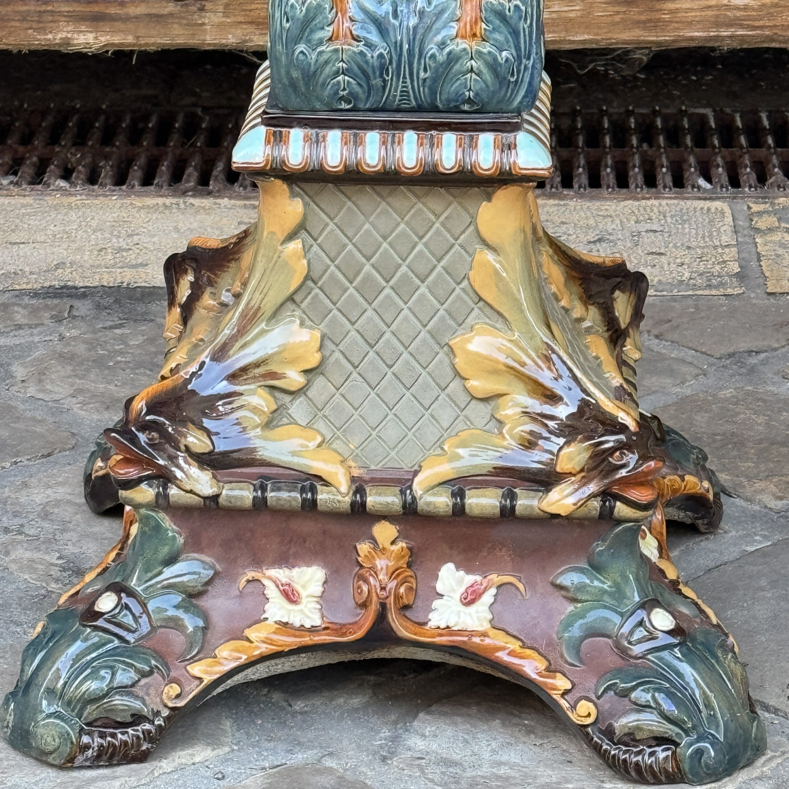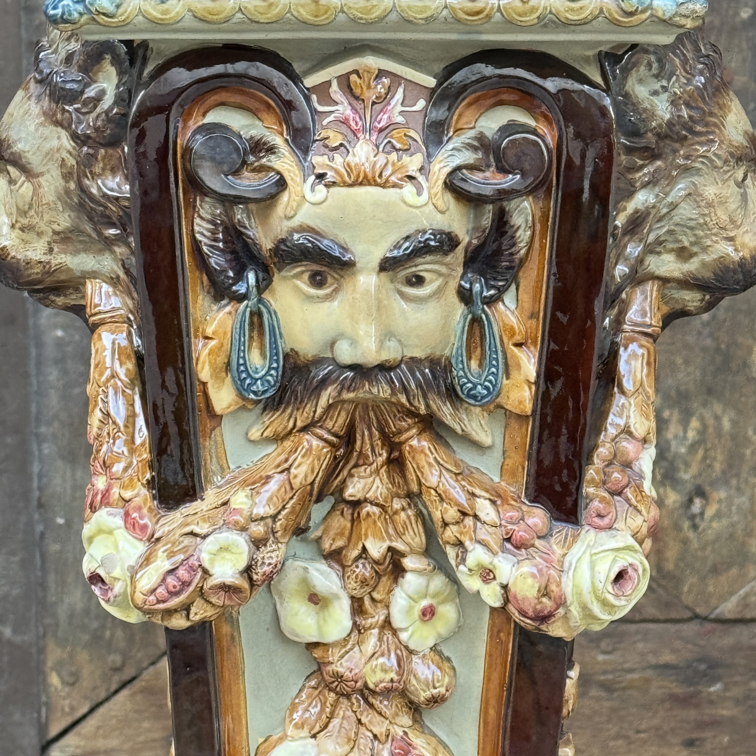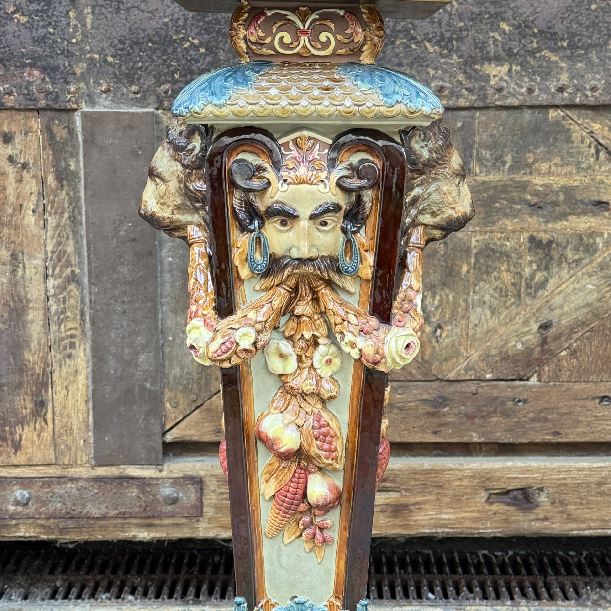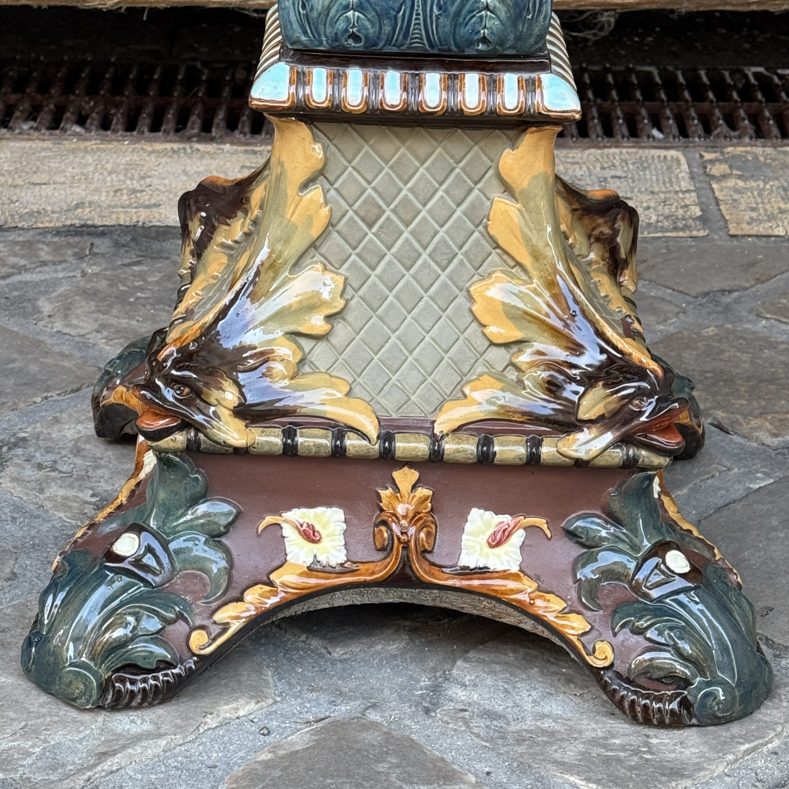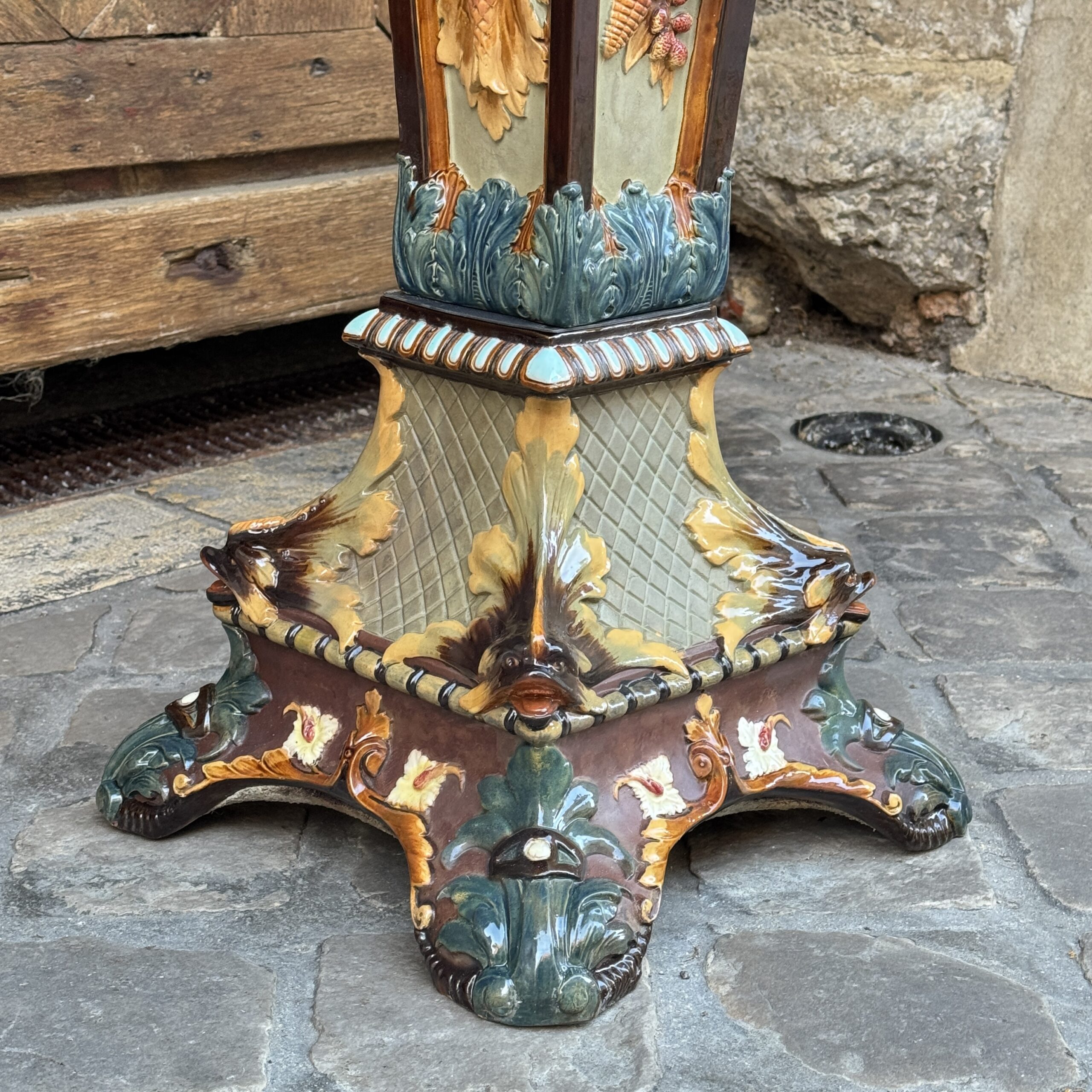 Colonne en faïence à décor de félin et d’homme de profils dont sorte de chaque bouche une guirlande de fleurs faisant le tour de la colonne. Dans le centre décor de fruits exotiques et base à décor de triton dans chaque angle.