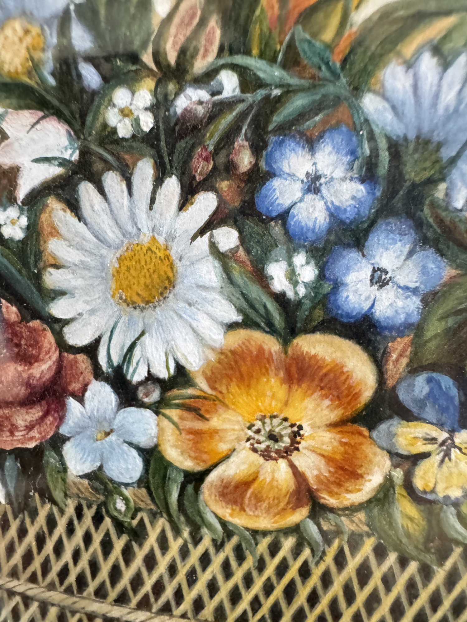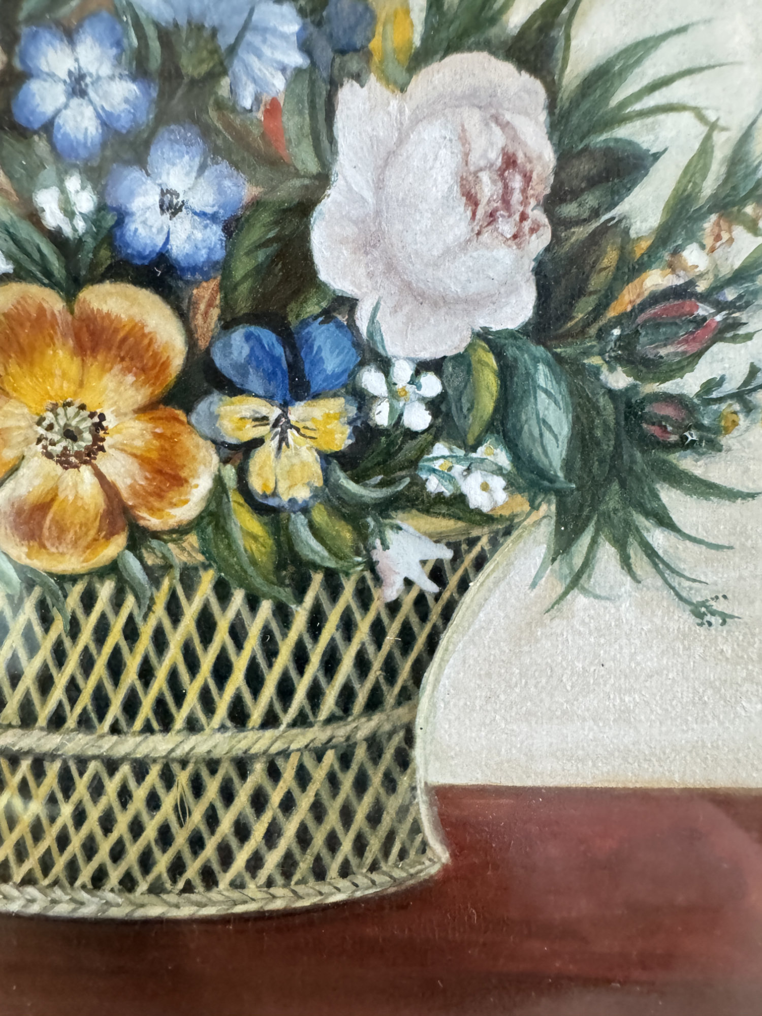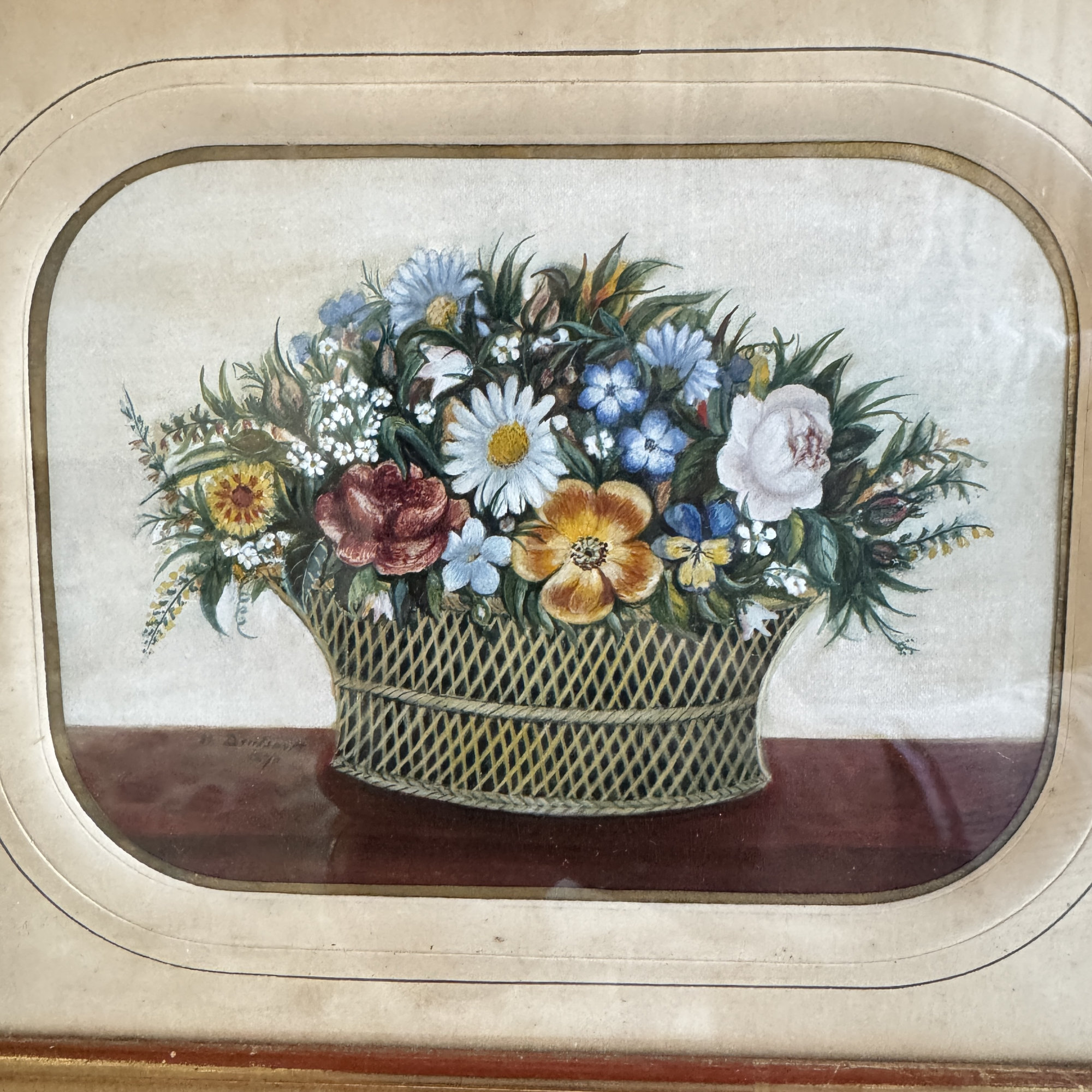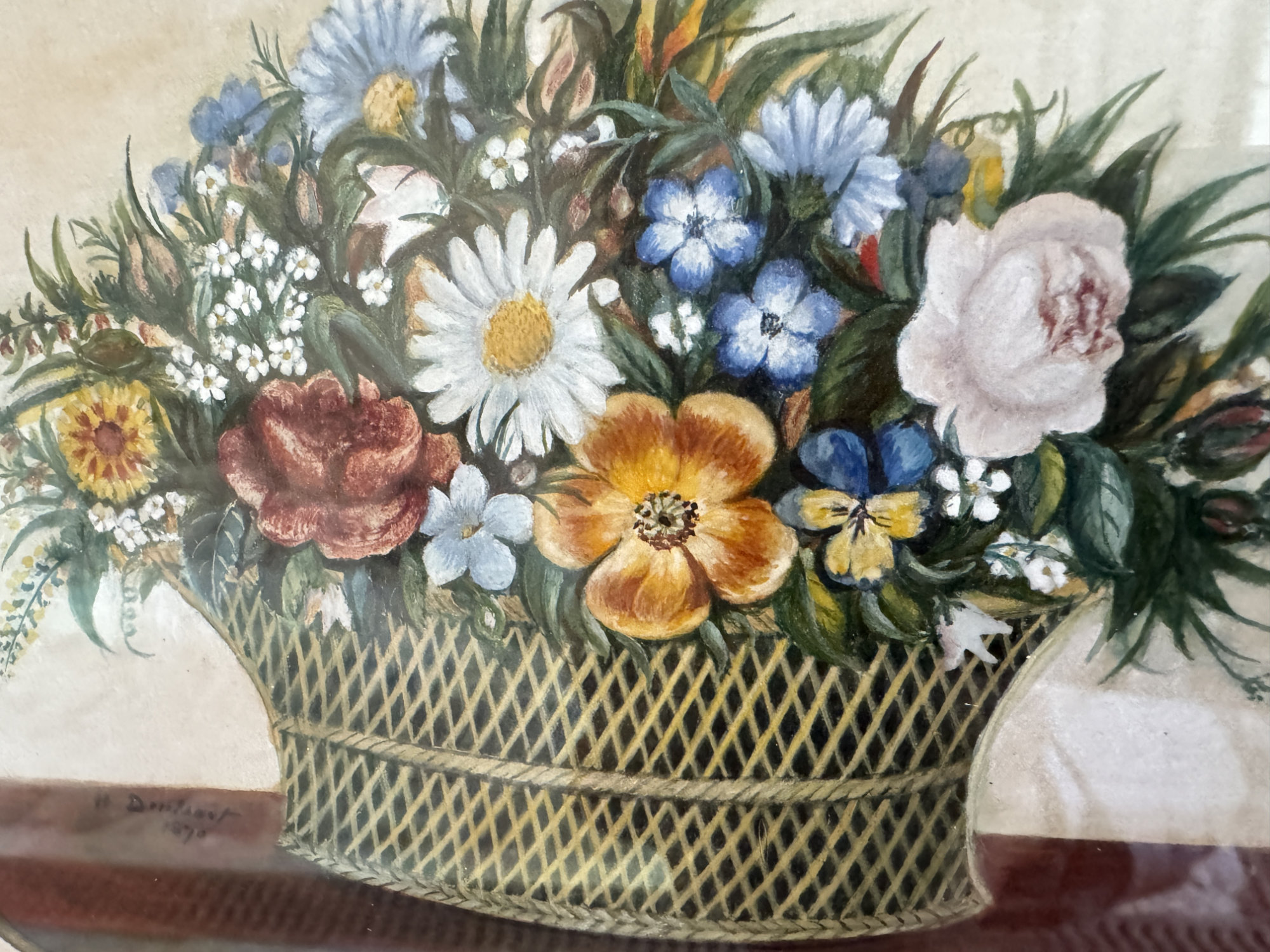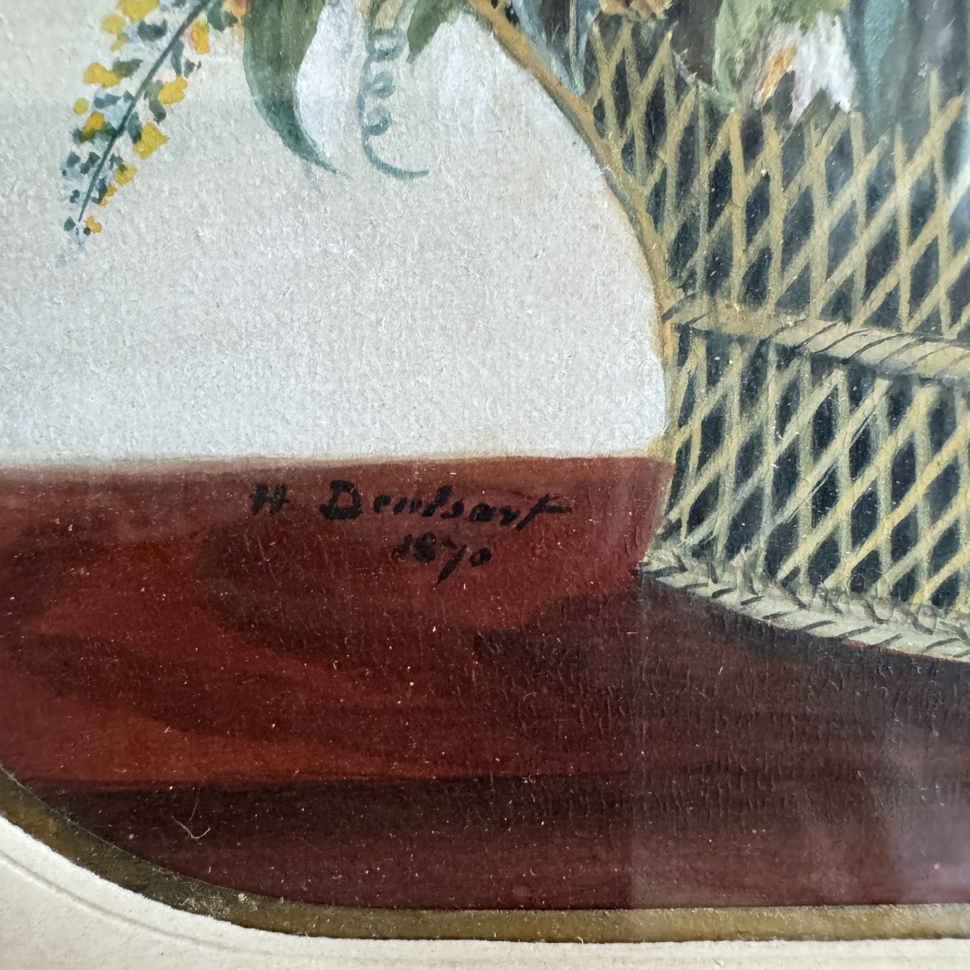 Gouache sur papier représentant un bouquet de fleurs dans une corbeille tressée signé H.Denlsart ou Denisart ? daté 1870