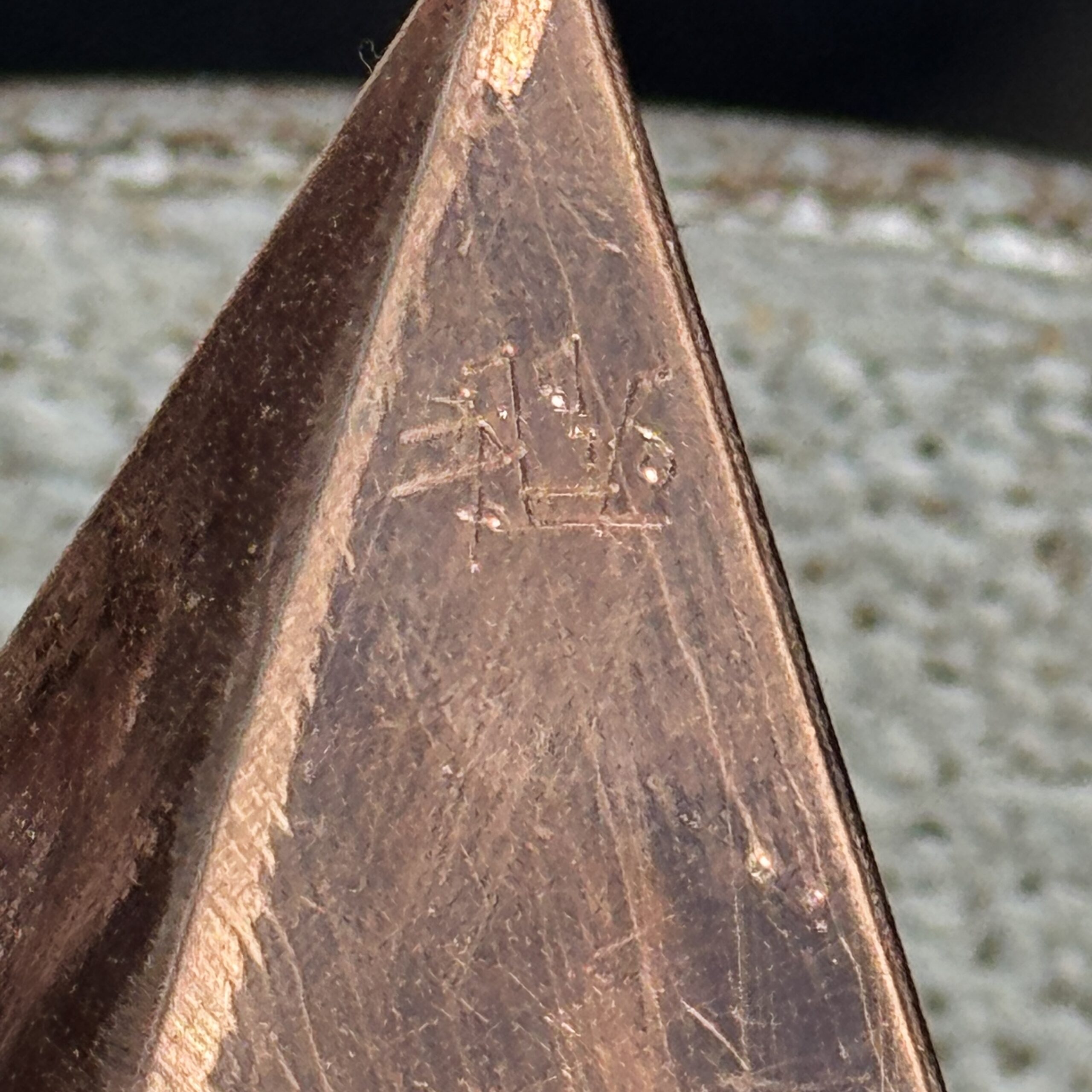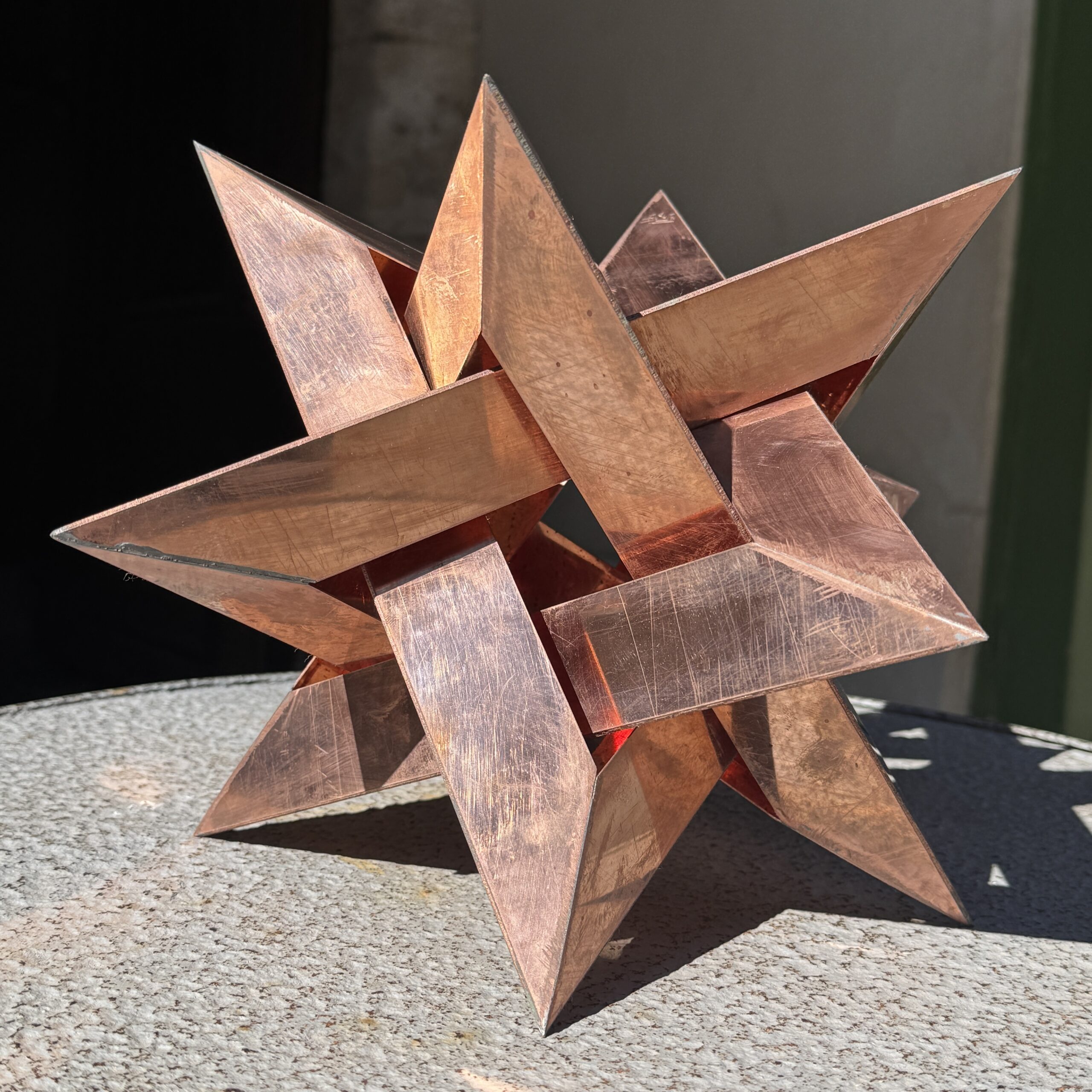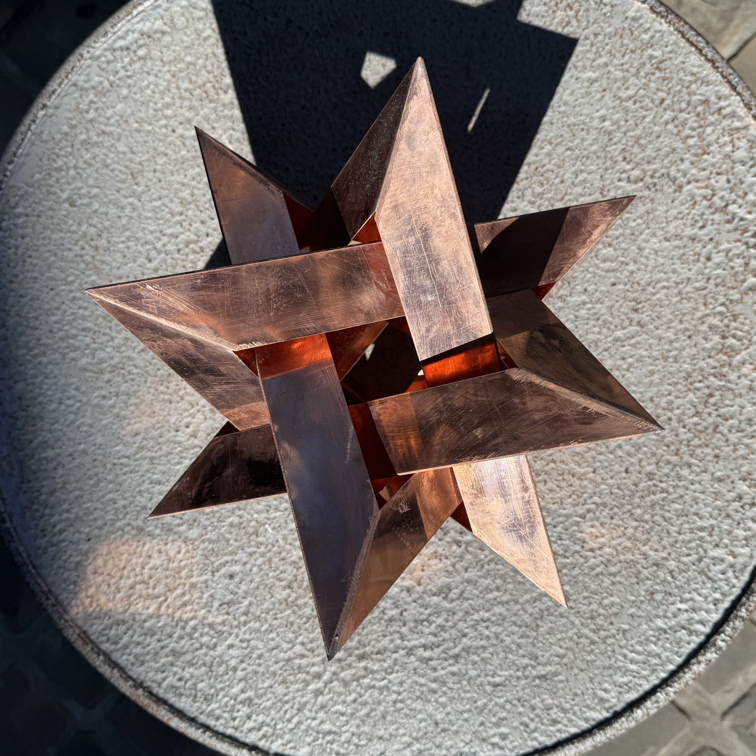 Forme polyédrique en cuivre à douze pointes composée de 4 éléments triangulaires imbriqués portant un monogramme ALB pour atelier du Losange Blanc. Joli travail de compagnon.