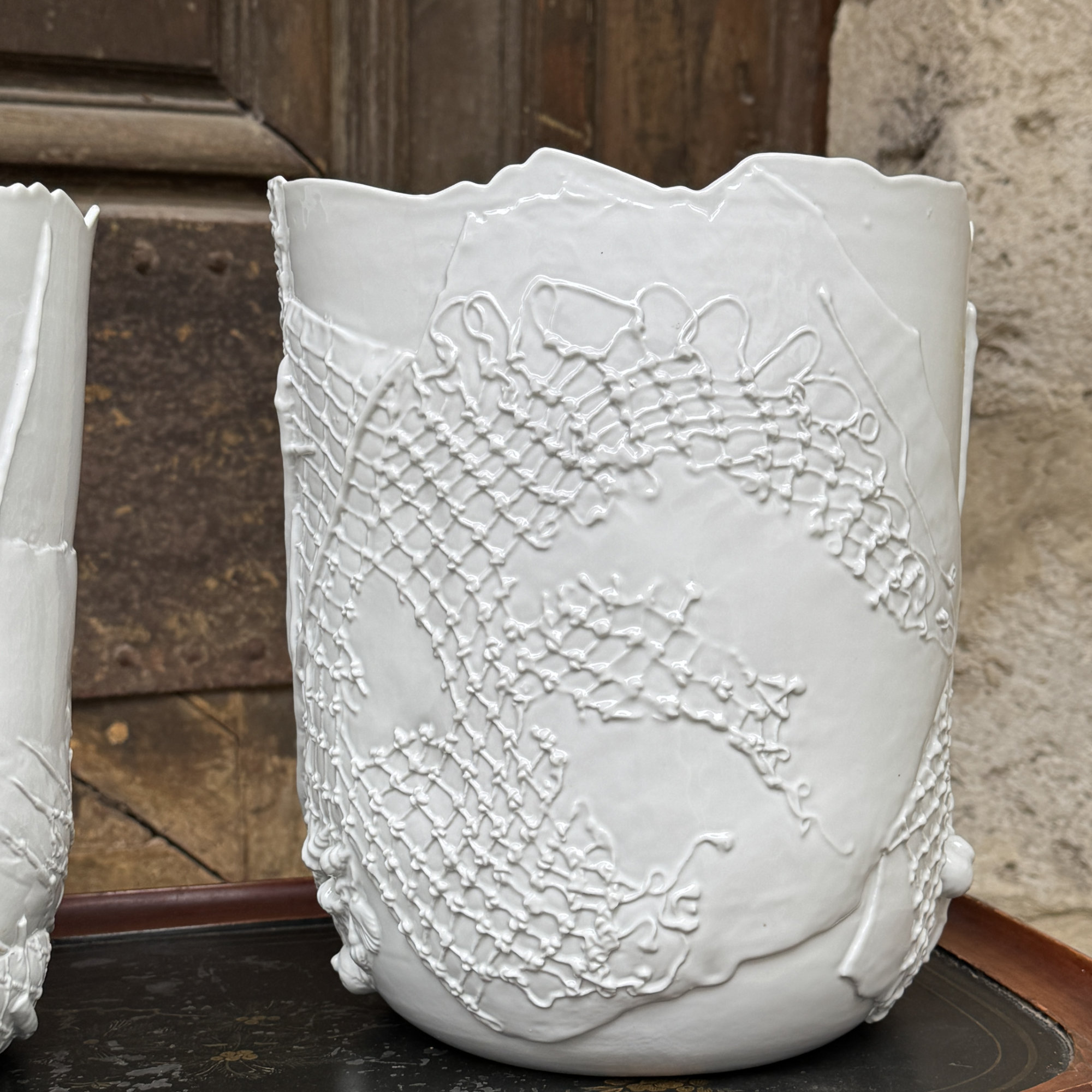 Paire de cache- pots en céramique blanche sur le thème des fonds marins (filets, coquillages, crustacés…). Signé Cristalli d’OGGI (italie).