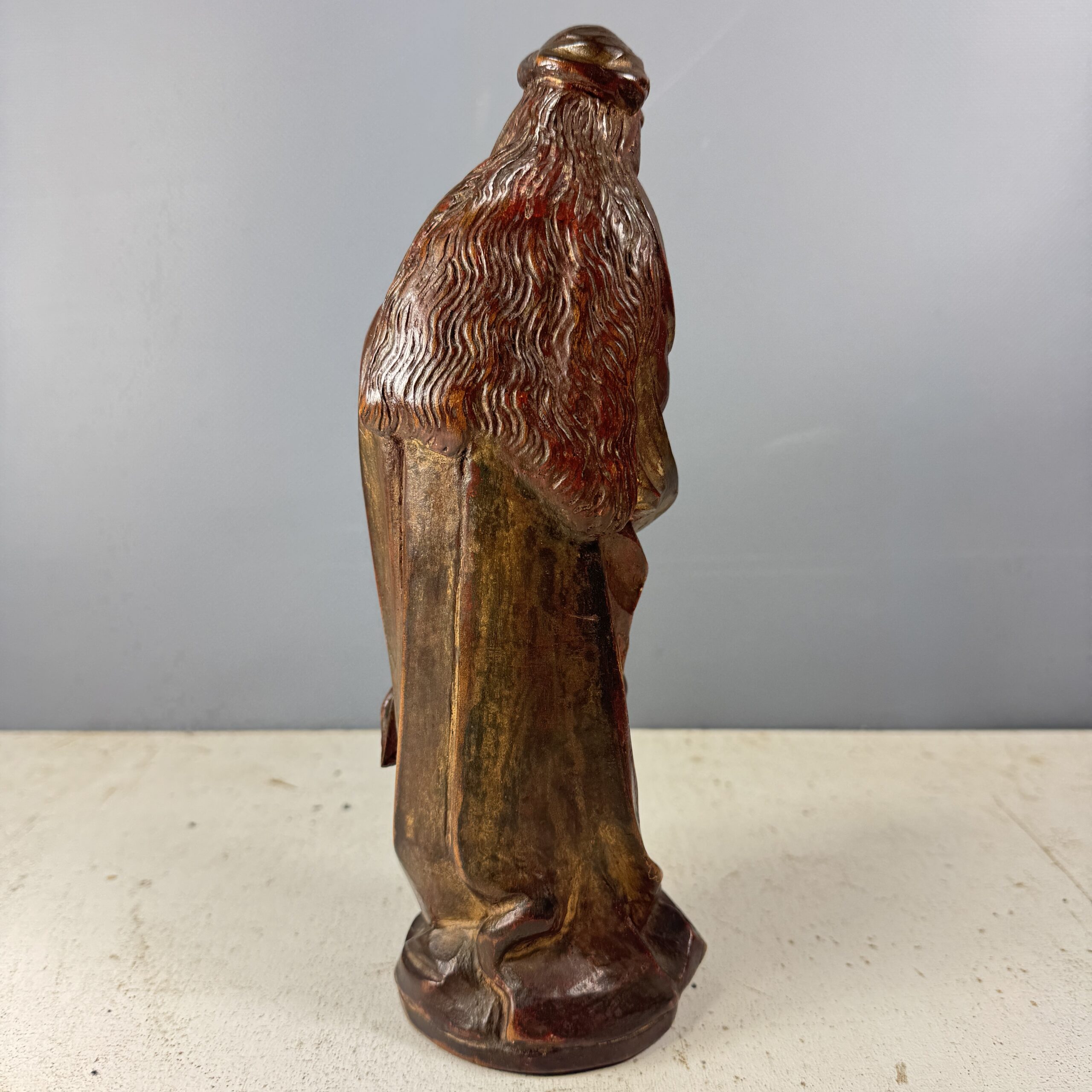 Vierge à l’enfant en bois sculpté avec trace de polychromie. L’enfant jésus tenant dans ses mains une grappe de raisin. Le voile de la vierge est tenu par une couronne de fleurs, nattes ondulées qui descendent de chaque côté de son visage. Joli volume de drapé dans la partie basse.