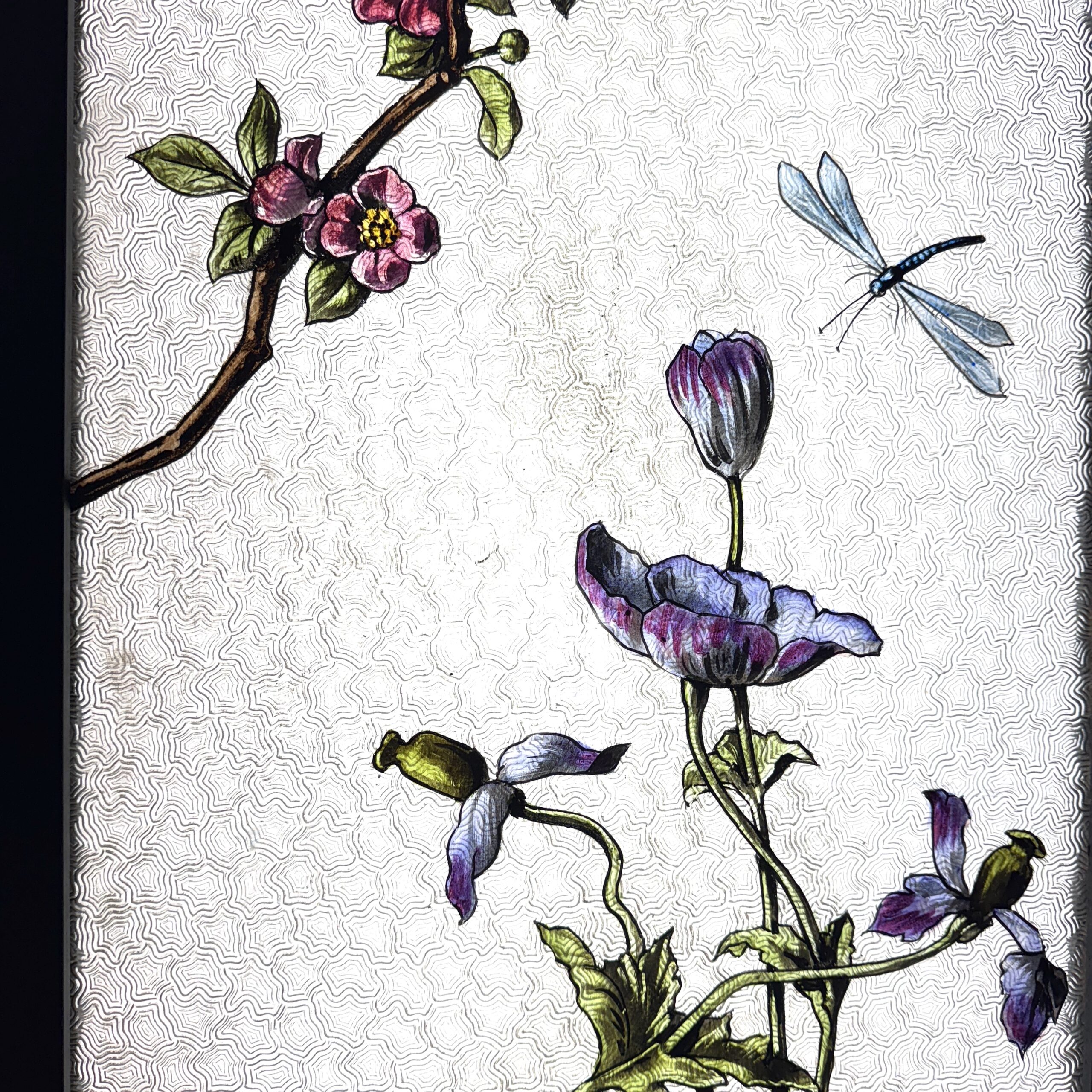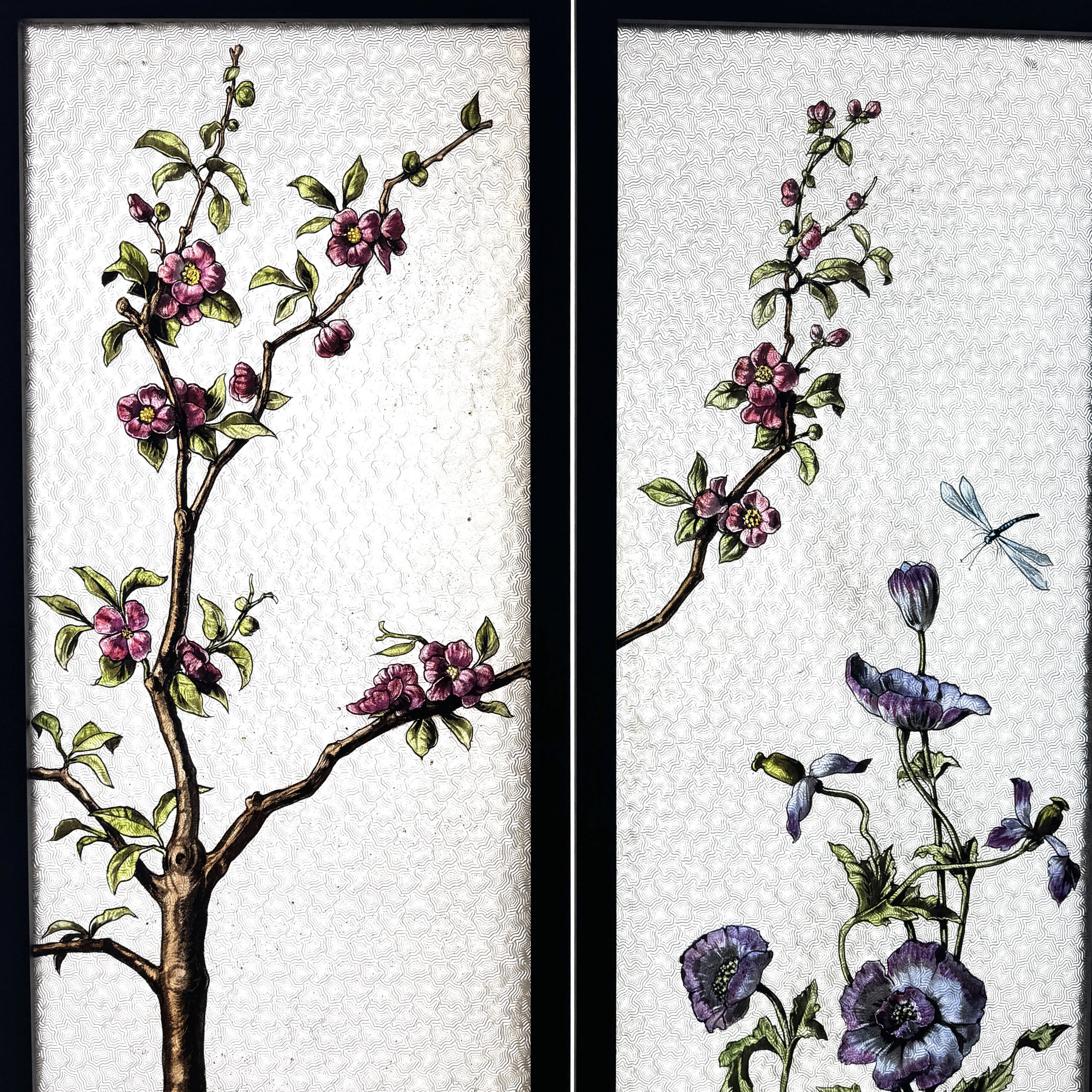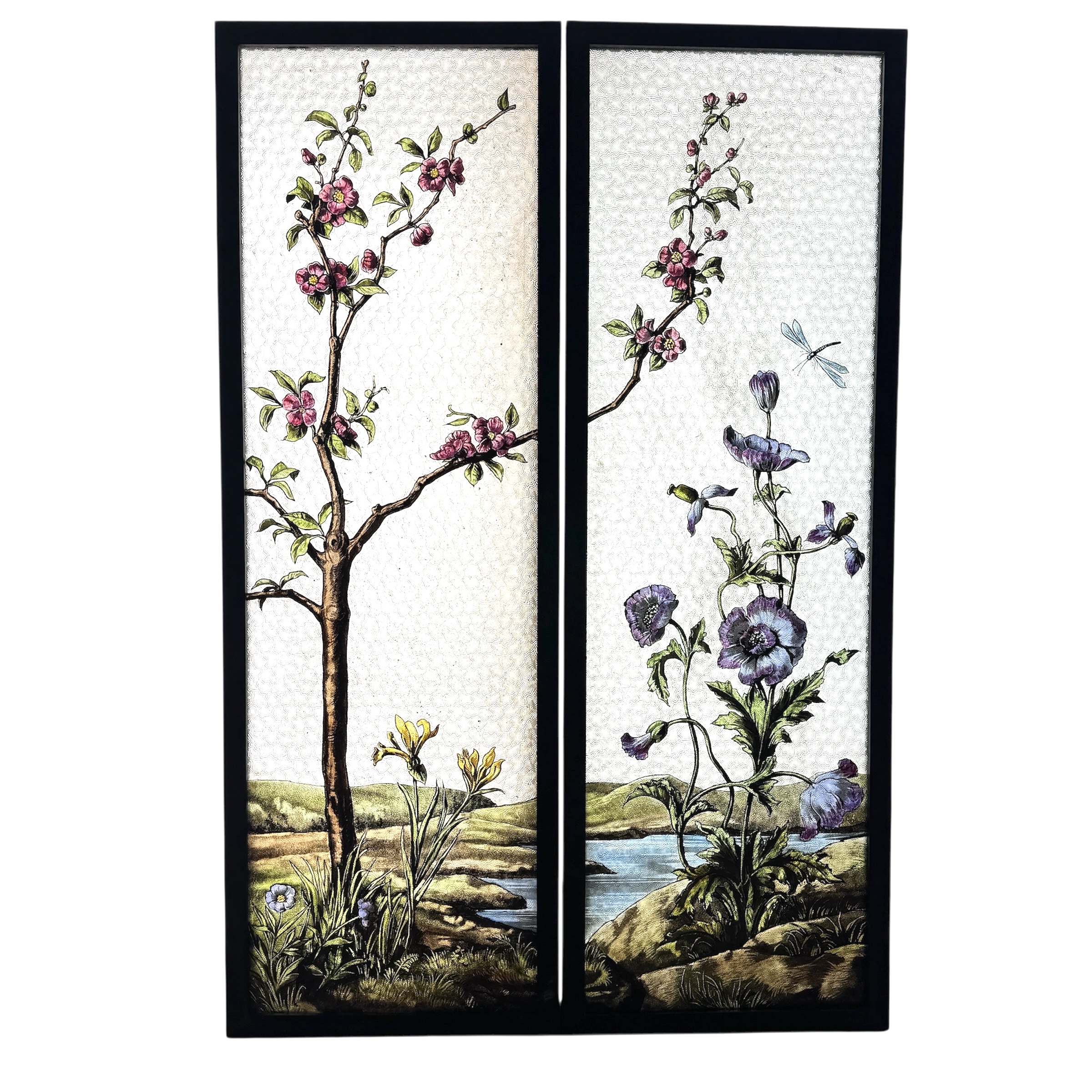 Paire de plaque de verre imprimée, peint en grisaille et aux émaux représentant un scène de bord d’étang avec au premier plan une fleur de pavot avec une libellule, un iris et un pommier du japon. En arrière plan un étang entouré de colline verdoyante.