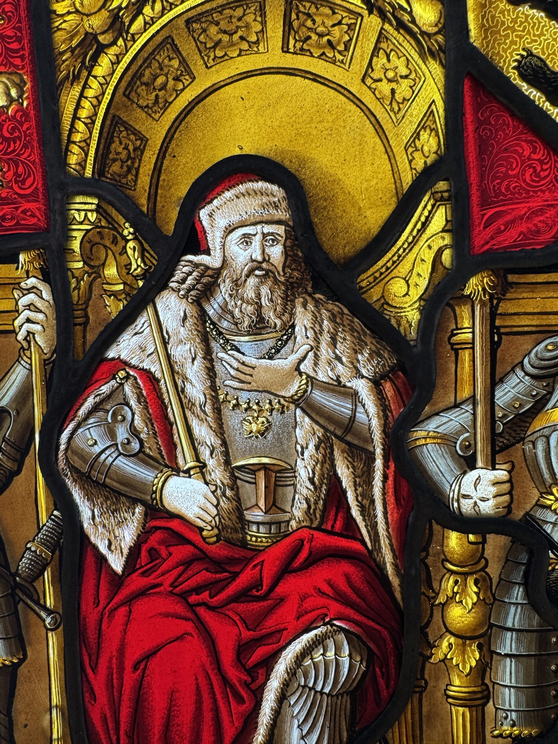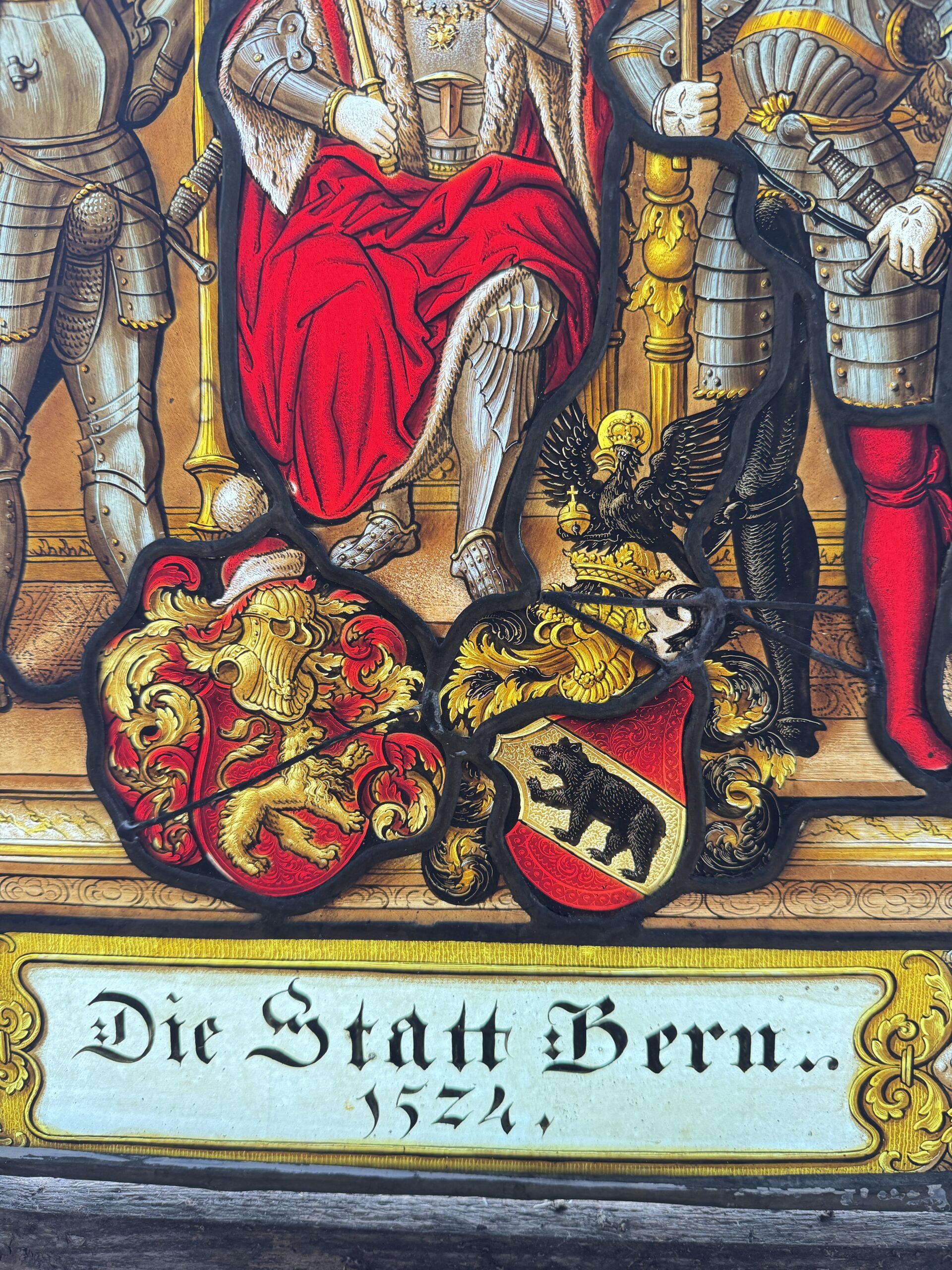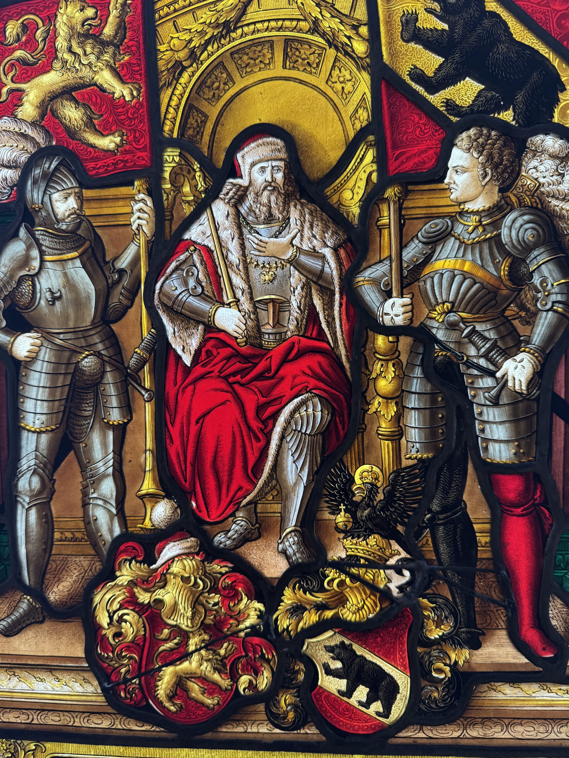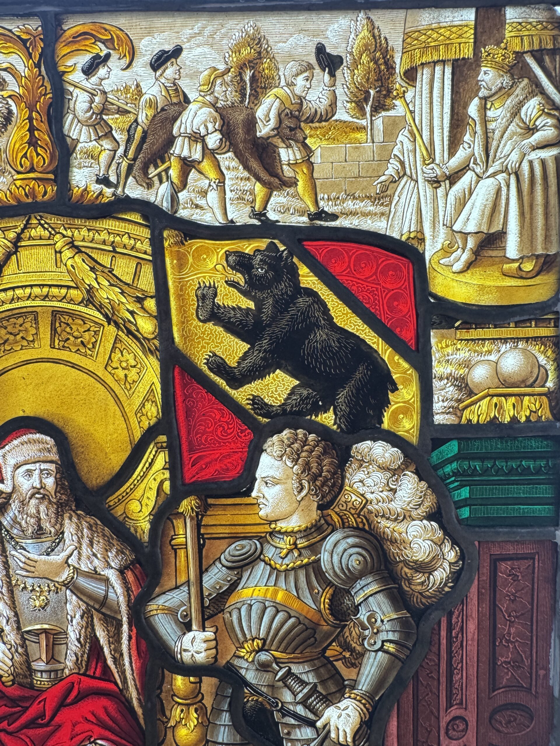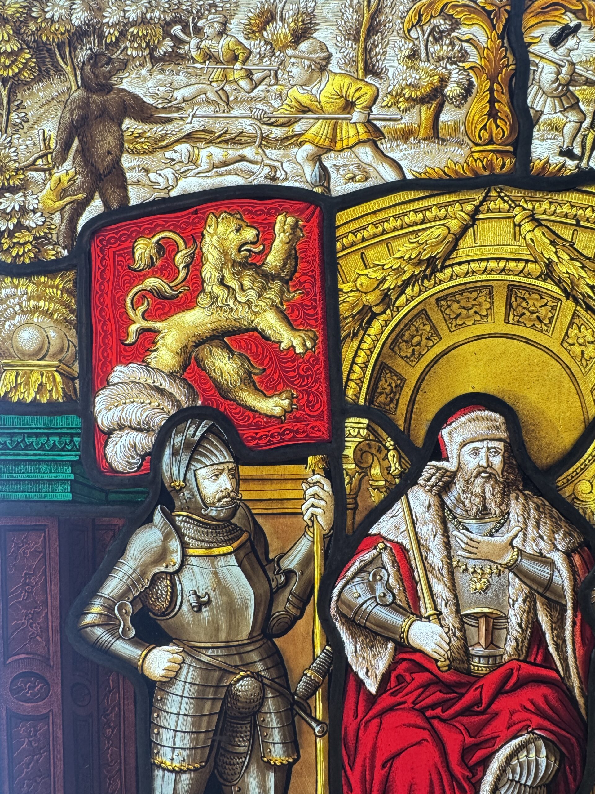 Vitrail de style renaissance peint en grisaille et aux émaux représentant le duc Berchtold V de Zähringen, fondateur de la cité de Bern qui aurait abattu selon la légende un ours sur le lieu d’implantation de la ville.