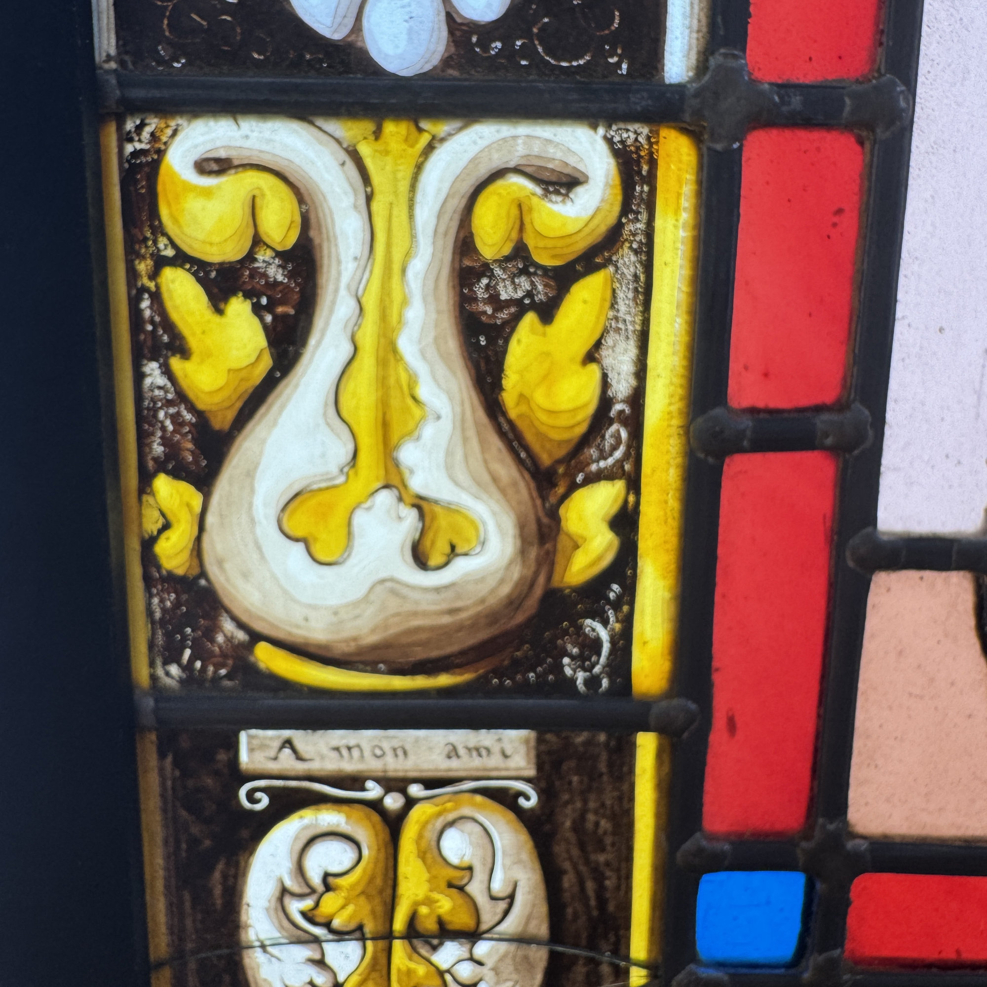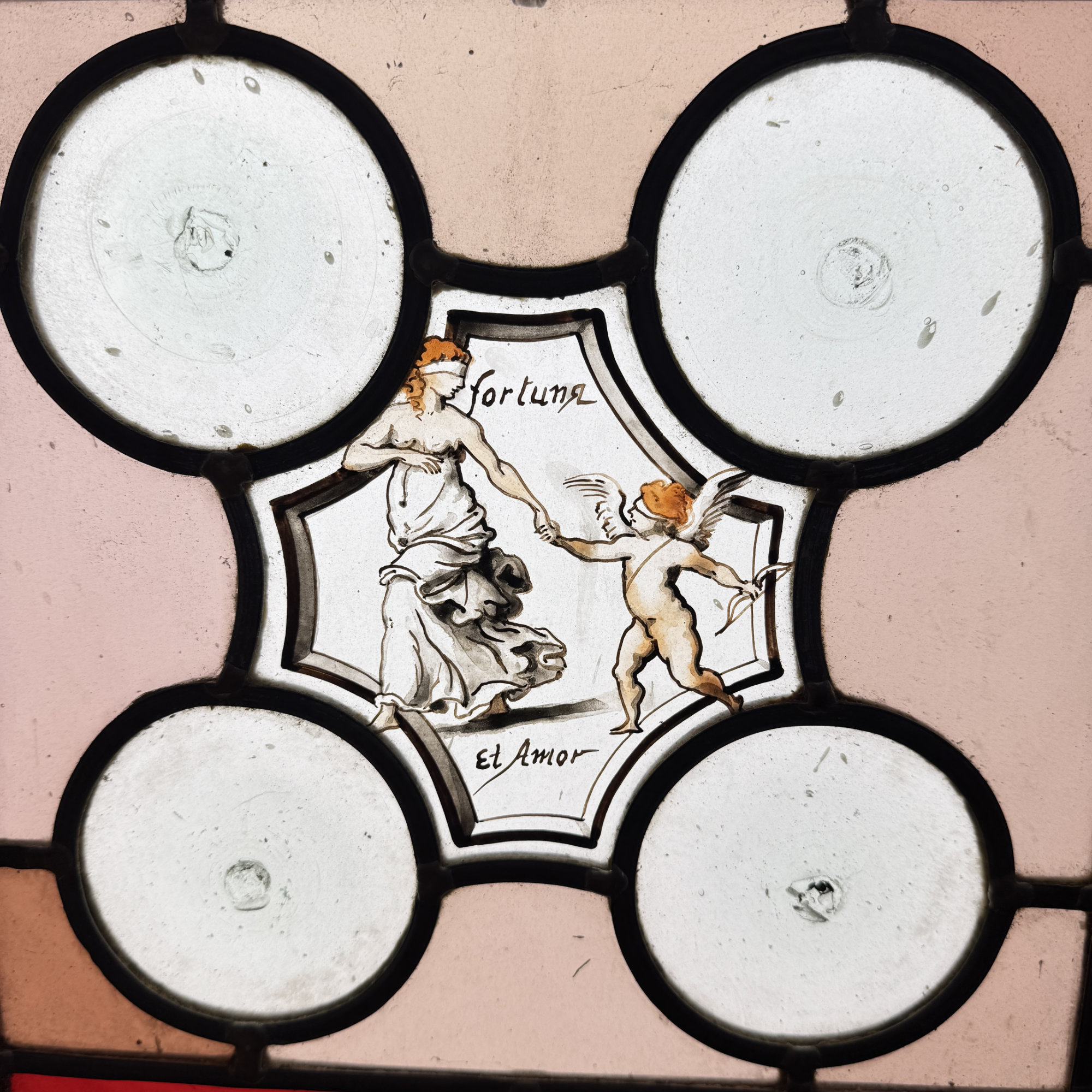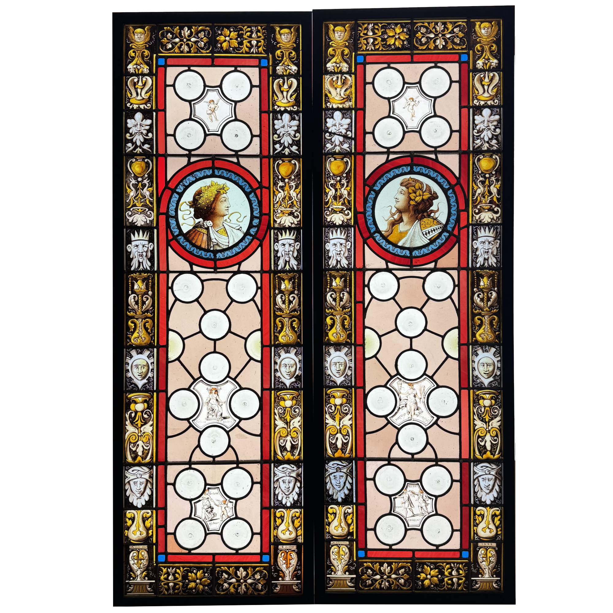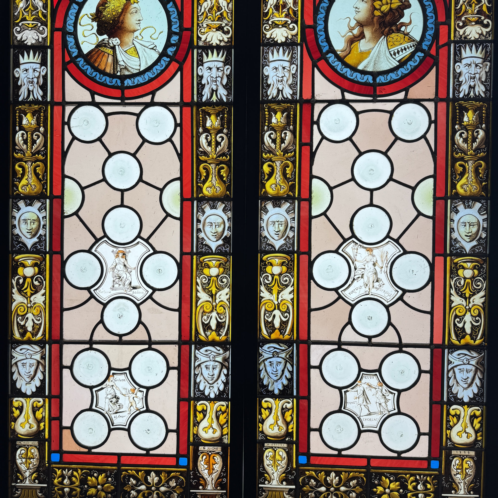 Paire de vitraux présentant des profils antiques se faisant face dans des médaillons encadrés de filets rouge et bleu. Le reste du vitrail est composé d’une mosaïque composée de cives ou fonds de bouteille et de verres de couleur rose, ponctuée de 4 miniatures illustrées. Dans chaque miniature, des citations latines qu’on peut traduire par “la fortune est capricieuse, la fortune est à double visage, et l’amour est aveugle.”