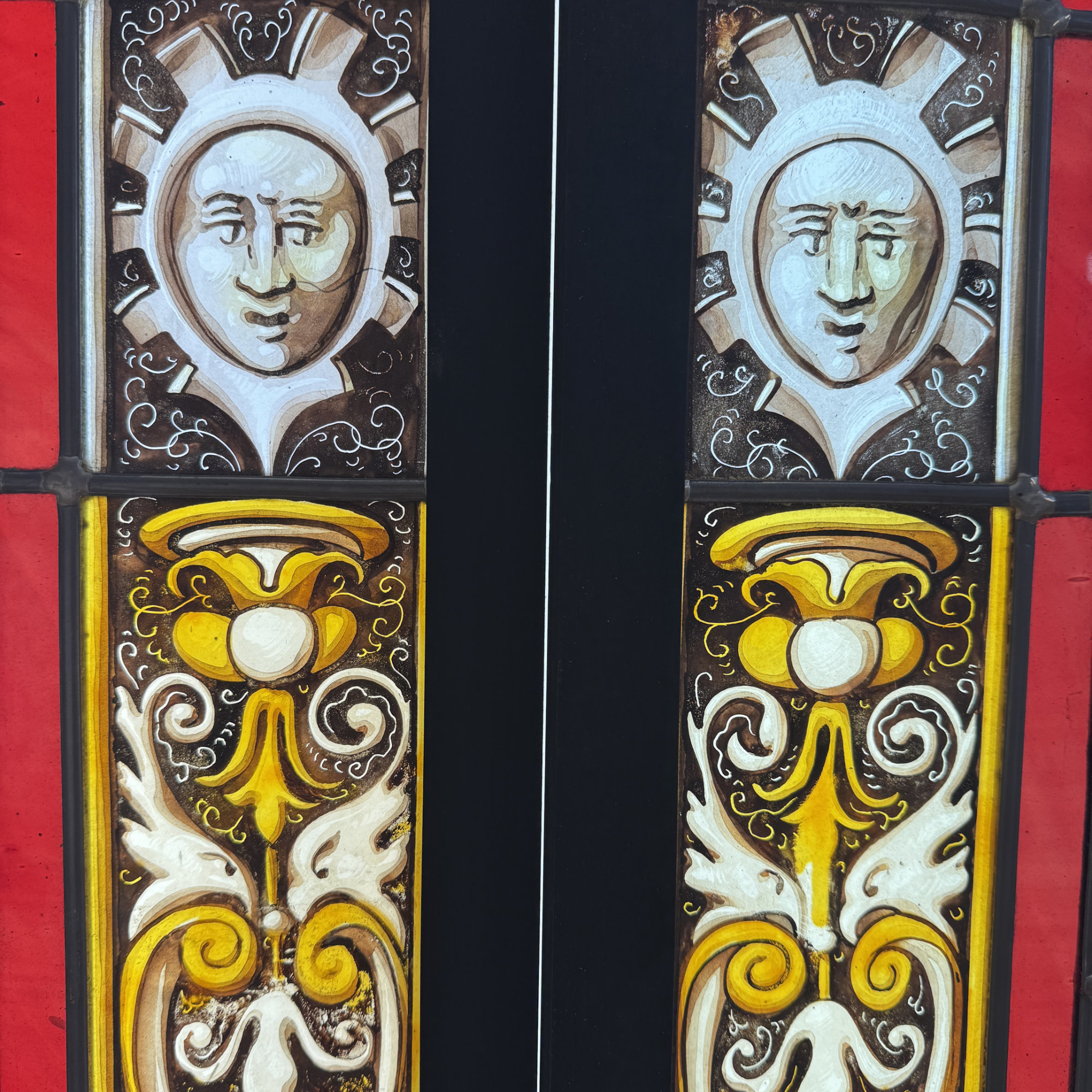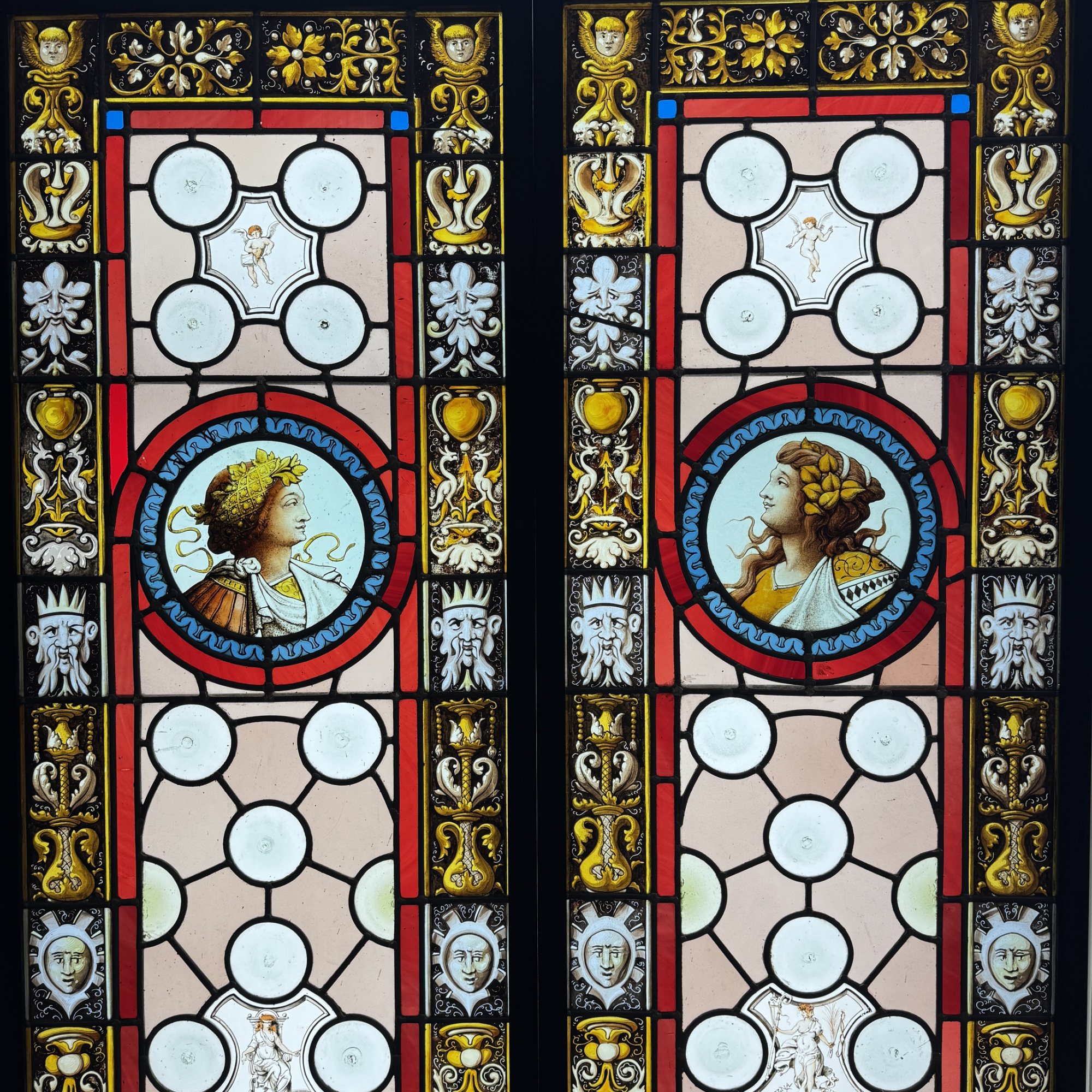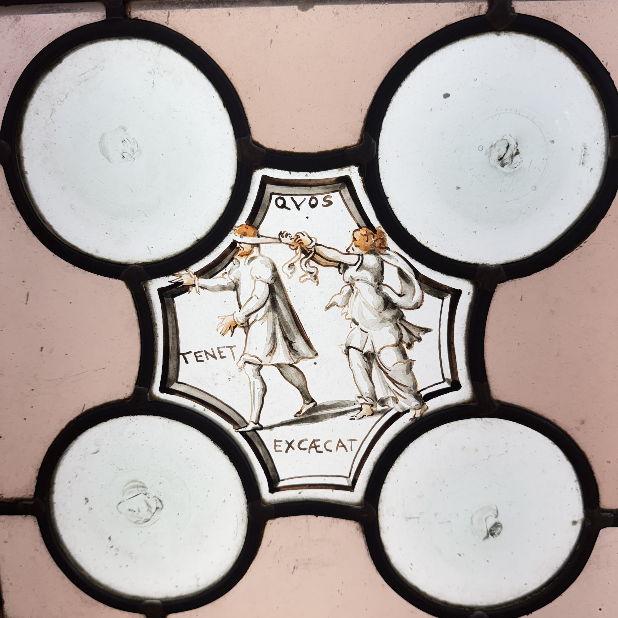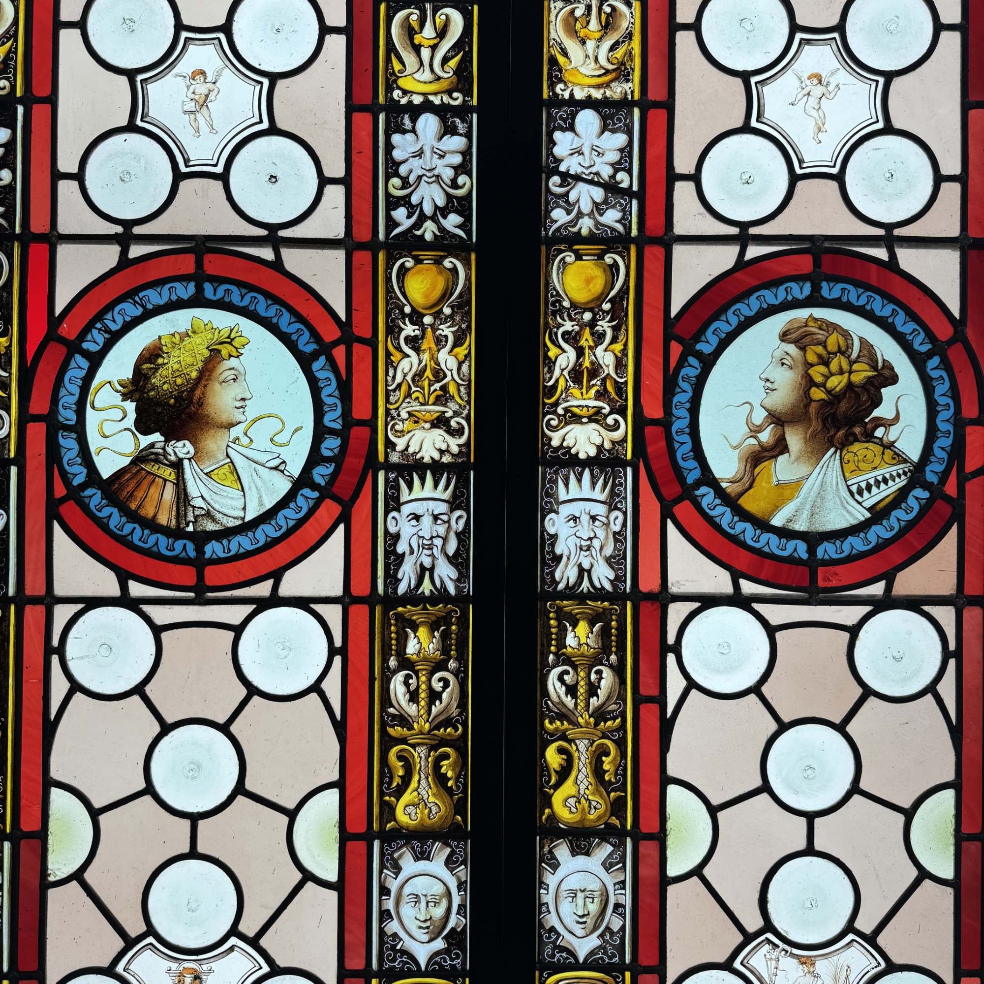 Paire de vitraux présentant des profils antiques se faisant face dans des médaillons encadrés de filets rouge et bleu. Le reste du vitrail est composé d’une mosaïque composée de cives ou fonds de bouteille et de verres de couleur rose, ponctuée de 4 miniatures illustrées. Dans chaque miniature, des citations latines qu’on peut traduire par “la fortune est capricieuse, la fortune est à double visage, et l’amour est aveugle.”
