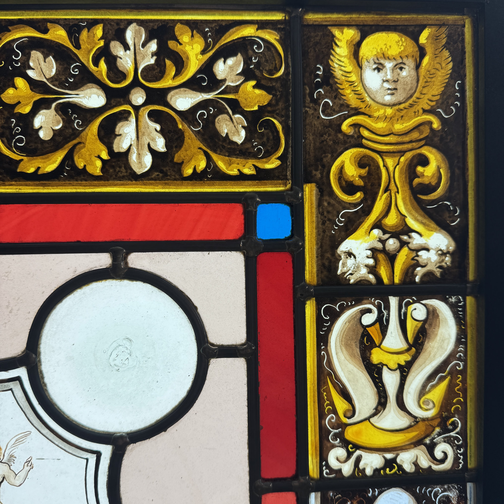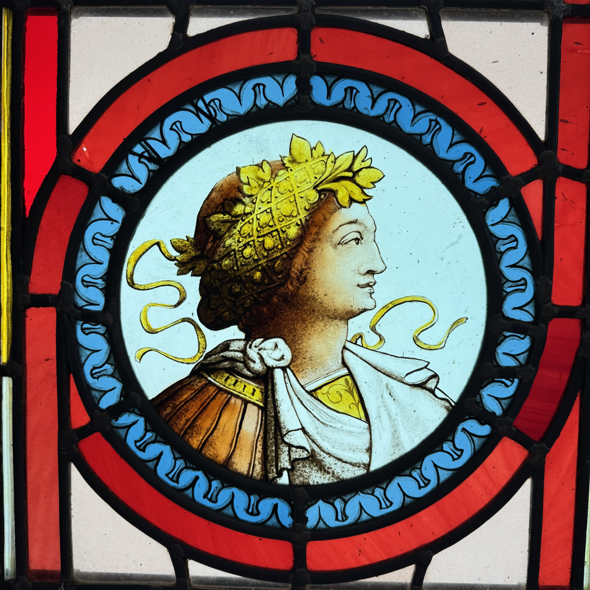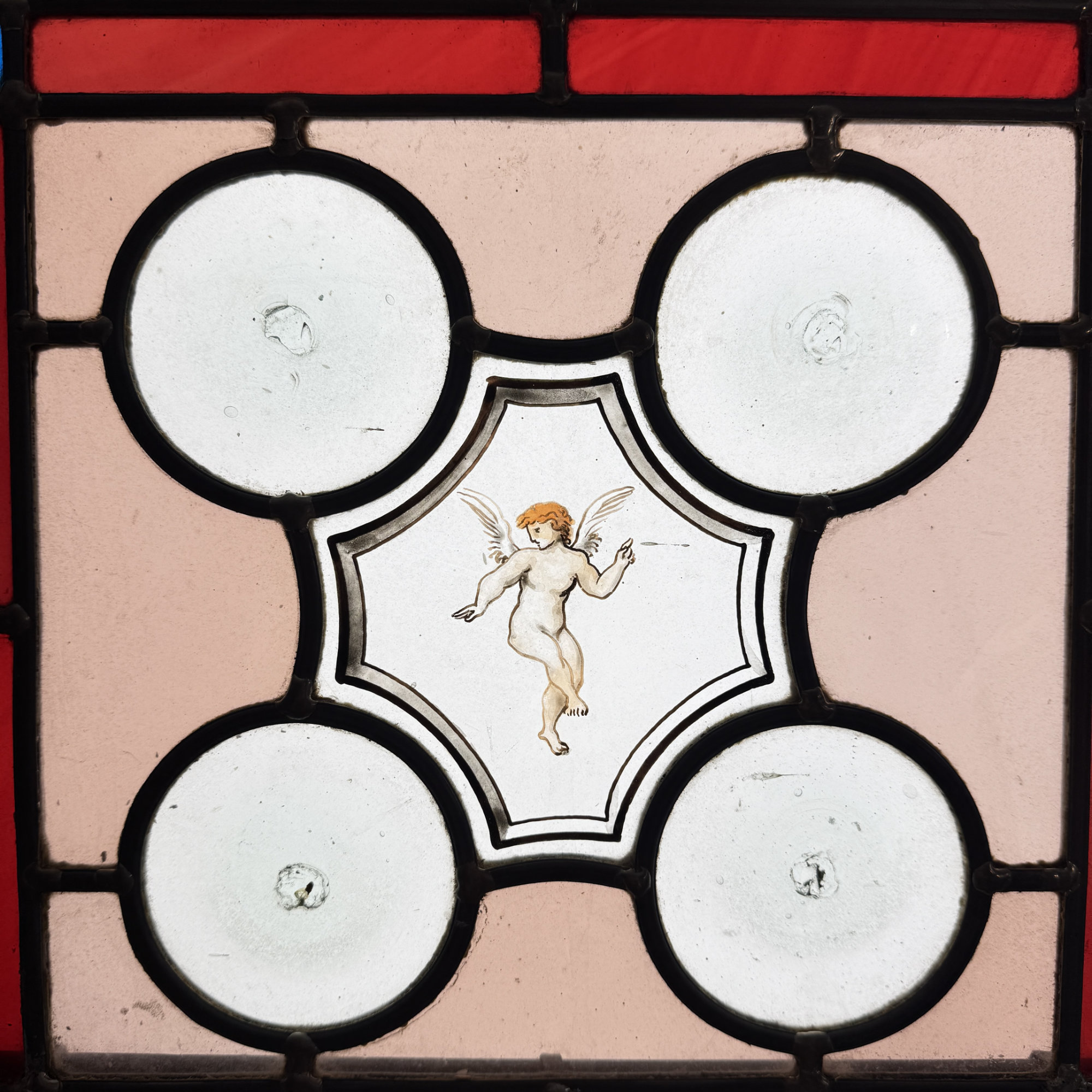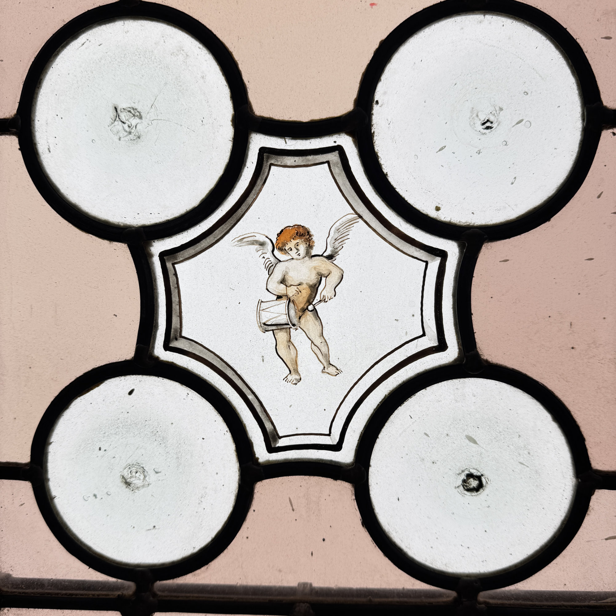 Paire de vitraux présentant des profils antiques se faisant face dans des médaillons encadrés de filets rouge et bleu. Le reste du vitrail est composé d’une mosaïque composée de cives ou fonds de bouteille et de verres de couleur rose, ponctuée de 4 miniatures illustrées. Dans chaque miniature, des citations latines qu’on peut traduire par “la fortune est capricieuse, la fortune est à double visage, et l’amour est aveugle.”