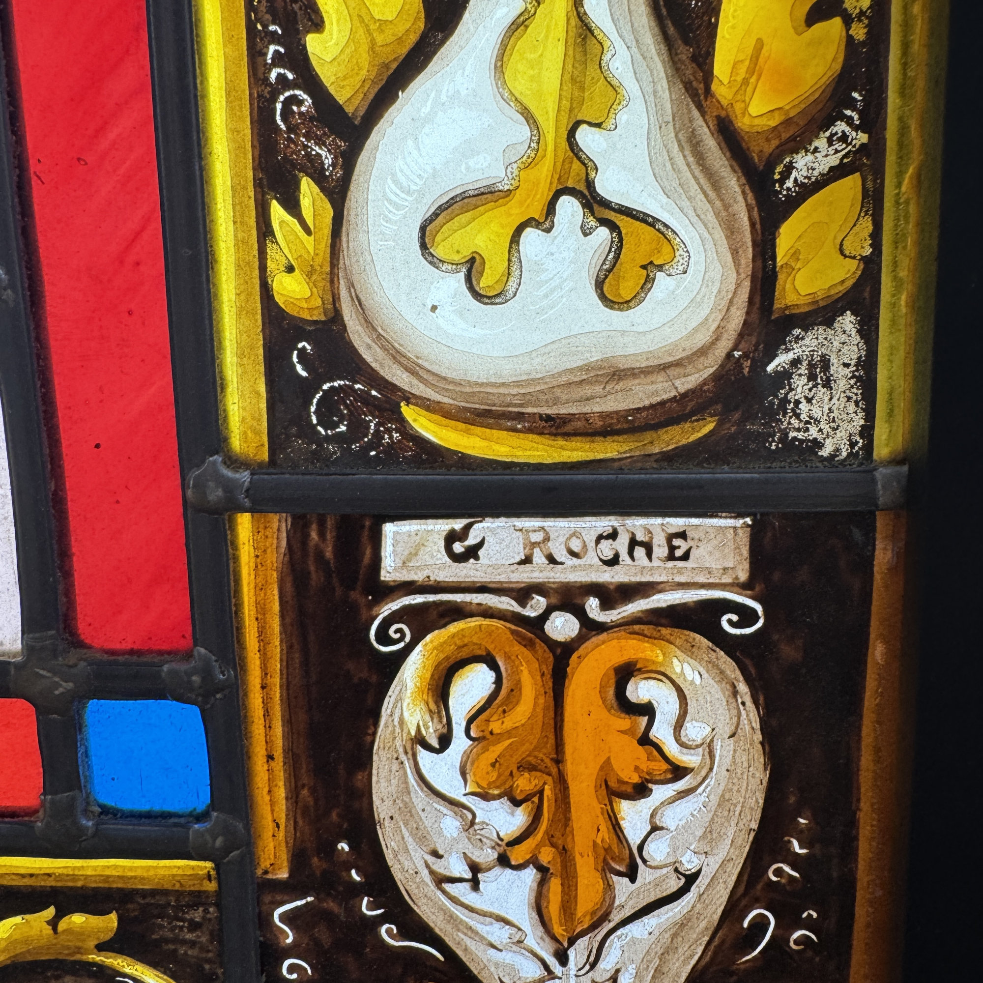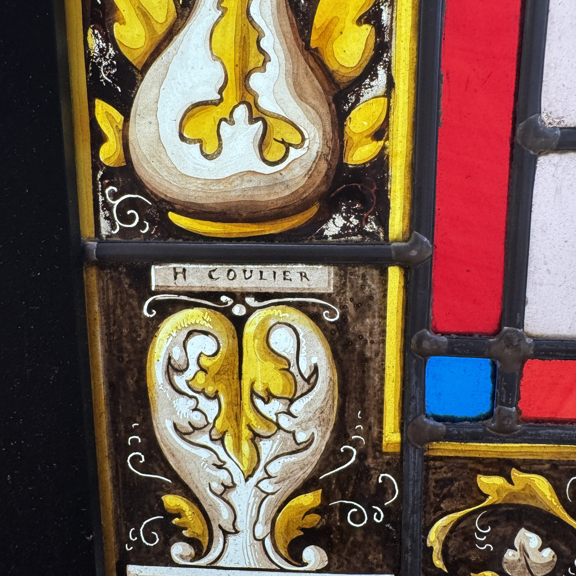 Les vitraux sont signés et dédicacés : “à mon ami G ROCHE, H COULIER, 1889”. François Henry Coulier (1855-1909) a été peintre verrier à Paris, membre de la chambre syndicale des maîtres verriers, il publie des articles dans la revue “Le journal de la peinture sur verre”. On retrouve deux de ses vitraux dans les collections du musée d’Orsay.